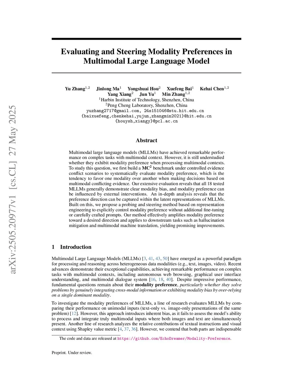 Multi-modal large language models (MLLMs) have achieved remarkable success on complex multi-modal tasks. However, it remains insufficiently explored whether they exhibit , a tendency to favor one modality over another when processing multi-modal contexts. To study this question, we introduce benchmark, which constructs controlled evidence-conflict scenarios to systematically evaluate modality preference in decision-making. Extensive experiments reveal that all 20 tested MLLMs generally demonstrate clear modality preferences, and such preferences can serve as a useful indicator of downstream task performance of MLLMs. Further analysis shows that modality preference can be controlled by instruction guidance and captured within the latent representations of MLLMs. Built on these insights, we propose a probing and steering method based on representation engineering to explicitly control modality preference without requiring additional fine-tuning. This method effectively amplifies modality preference toward a desired direction and demonstrates promising improvements across multiple multi-modal understanding and reasoning tasks.