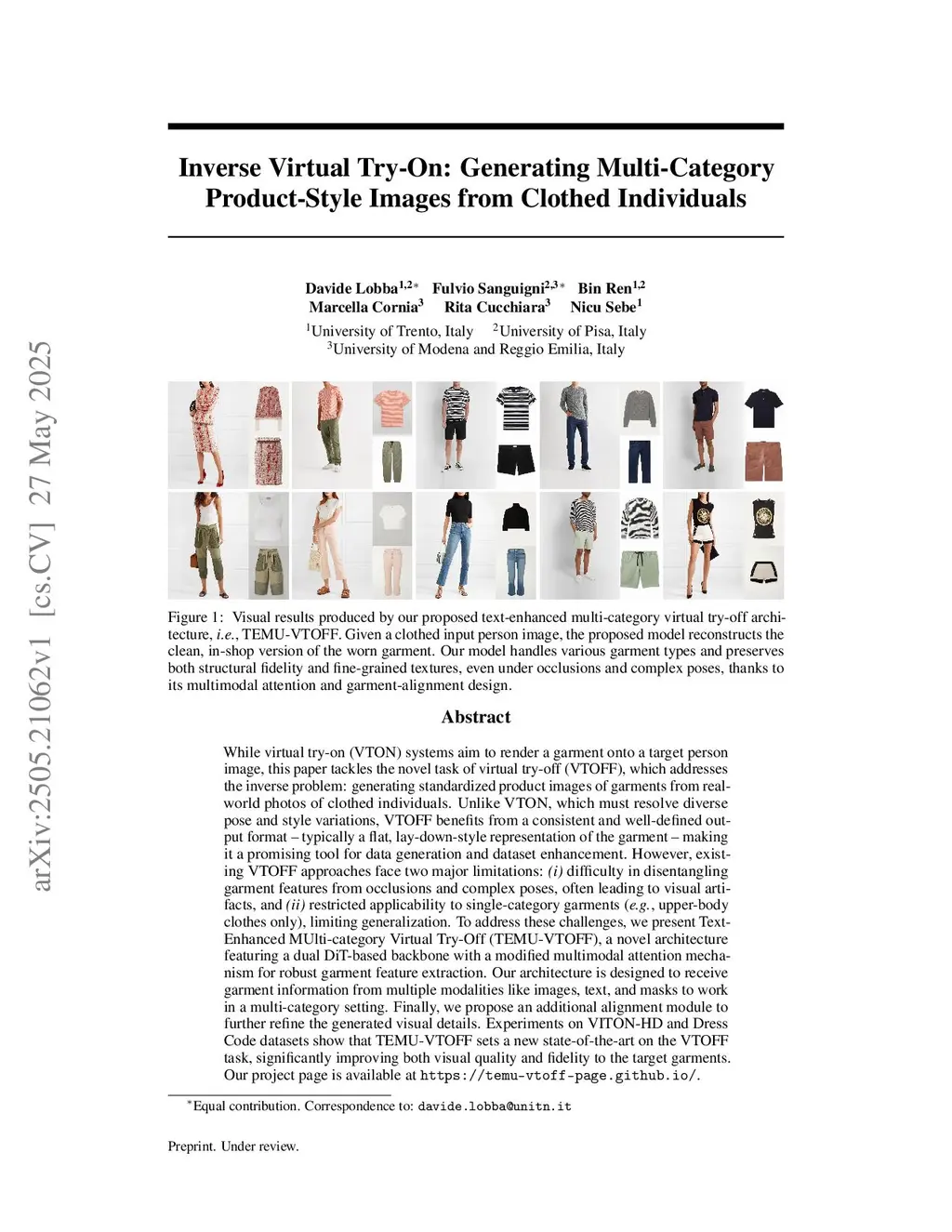 Virtual try-on (VTON) has been widely explored for rendering garments onto person images, while its inverse task, virtual try-off (VTOFF), remains largely overlooked. VTOFF aims to recover standardized product images of garments directly from photos of clothed individuals. This capability is of great practical importance for e-commerce platforms, large-scale dataset curation, and the training of foundation models. Unlike VTON, which must handle diverse poses and styles, VTOFF naturally benefits from a consistent output format in the form of flat garment images. However, existing methods face two major limitations: (i) exclusive reliance on visual cues from a single photo often leads to ambiguity, and (ii) generated images usually suffer from loss of fine details, limiting their real-world applicability. To address these challenges, we introduce TEMU-VTOFF, a Text-Enhanced MUlti-category framework for VTOFF. Our architecture is built on a dual DiT-based backbone equipped with a multimodal attention mechanism that jointly exploits image, text, and mask information to resolve visual ambiguities and enable robust feature learning across garment categories. To explicitly mitigate detail degradation, we further design an alignment module that refines garment structures and textures, ensuring high-quality outputs. Extensive experiments on VITON-HD and Dress Code show that TEMU-VTOFF achieves new state-of-the-art performance, substantially improving both visual realism and consistency with target garments.