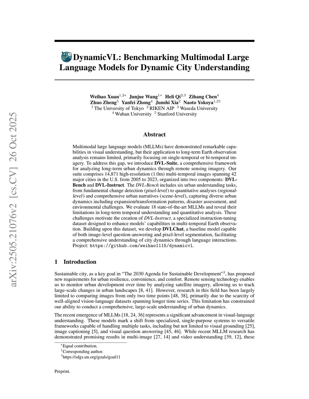 Multimodal large language models (MLLMs) have demonstrated remarkable capabilities in visual understanding, but their application to long-term Earth observation analysis remains limited, primarily focusing on single-temporal or bi-temporal imagery. To address this gap, we introduce DVL-Suite, a comprehensive framework for analyzing long-term urban dynamics through remote sensing imagery. Our suite comprises 14,871 high-resolution (1.0m) multi-temporal images spanning 42 major cities in the U.S. from 2005 to 2023, organized into two components: DVL-Bench and DVL-Instruct. The DVL-Bench includes six urban understanding tasks, from fundamental change detection (pixel-level) to quantitative analyses (regional-level) and comprehensive urban narratives (scene-level), capturing diverse urban dynamics including expansion/transformation patterns, disaster assessment, and environmental challenges. We evaluate 18 state-of-the-art MLLMs and reveal their limitations in long-term temporal understanding and quantitative analysis. These challenges motivate the creation of DVL-Instruct, a specialized instruction-tuning dataset designed to enhance models' capabilities in multi-temporal Earth observation. Building upon this dataset, we develop DVLChat, a baseline model capable of both image-level question-answering and pixel-level segmentation, facilitating a comprehensive understanding of city dynamics through language interactions.