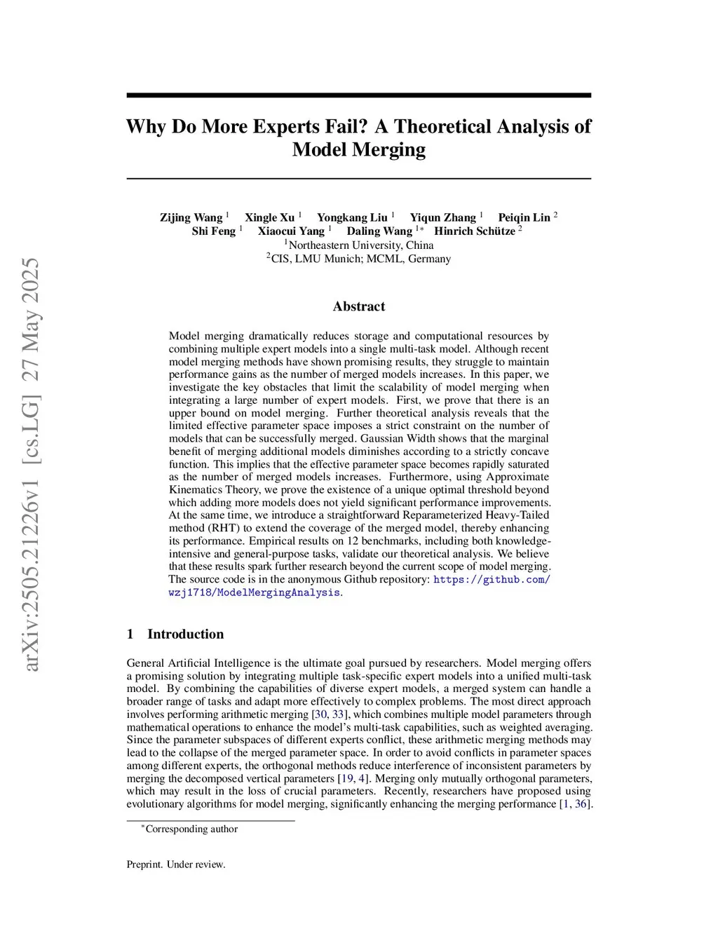 Model merging dramatically reduces storage and computational resources by combining multiple expert models into a single multi-task model. Although recent model merging methods have shown promising results, they struggle to maintain performance gains as the number of merged models increases. In this paper, we investigate the key obstacles that limit the scalability of model merging when integrating a large number of expert models. First, we prove that there is an upper bound on model merging. Further theoretical analysis reveals that the limited effective parameter space imposes a strict constraint on the number of models that can be successfully merged. Gaussian Width shows that the marginal benefit of merging additional models diminishes according to a strictly concave function. This implies that the effective parameter space becomes rapidly saturated as the number of merged models increases. Furthermore, using Approximate Kinematics Theory, we prove the existence of a unique optimal threshold beyond which adding more models does not yield significant performance improvements. At the same time, we introduce a straightforward Reparameterized Heavy-Tailed method (RHT) to extend the coverage of the merged model, thereby enhancing its performance. Empirical results on 12 benchmarks, including both knowledge-intensive and general-purpose tasks, validate our theoretical analysis. We believe that these results spark further research beyond the current scope of model merging. The source code is in the anonymous Github repository this https URL.