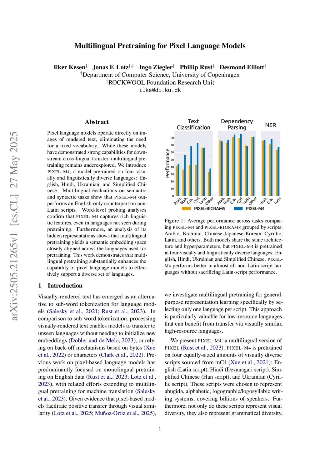 Pixel language models operate directly on images of rendered text, eliminating the need for a fixed vocabulary. While these models have demonstrated strong capabilities for downstream cross-lingual transfer, multilingual pretraining remains underexplored. We introduce PIXEL-M4, a model pretrained on four visually and linguistically diverse languages: English, Hindi, Ukrainian, and Simplified Chinese. Multilingual evaluations on semantic and syntactic tasks show that PIXEL-M4 outperforms an English-only counterpart on non-Latin scripts. Word-level probing analyses confirm that PIXEL-M4 captures rich linguistic features, even in languages not seen during pretraining. Furthermore, an analysis of its hidden representations shows that multilingual pretraining yields a semantic embedding space closely aligned across the languages used for pretraining. This work demonstrates that multilingual pretraining substantially enhances the capability of pixel language models to effectively support a diverse set of languages.