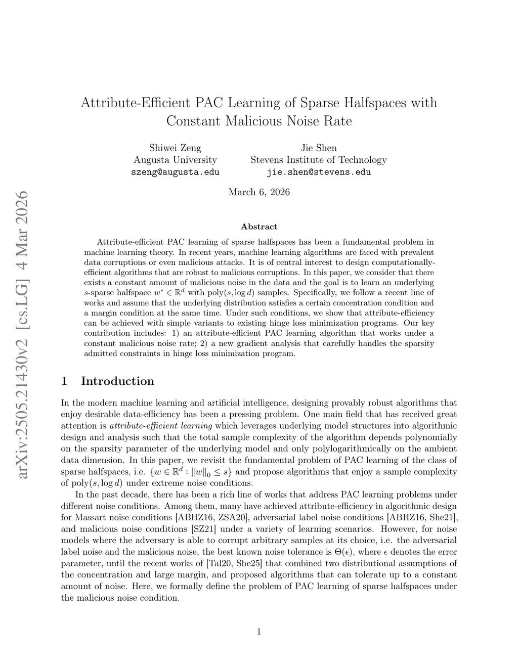 Attribute-efficient PAC learning of sparse halfspaces has been a fundamental problem in machine learning theory. In recent years, machine learning algorithms are faced with prevalent data corruptions or even malicious attacks. It is of central interest to design computationally-efficient algorithms that are robust to malicious corruptions. In this paper, we consider that there exists a constant amount of malicious noise in the data and the goal is to learn an underlying -sparse halfspace with samples. Specifically, we follow a recent line of works and assume that the underlying distribution satisfies a certain concentration condition and a margin condition at the same time. Under such conditions, we show that attribute-efficiency can be achieved with simple variants to existing hinge loss minimization programs. Our key contribution includes: 1) an attribute-efficient PAC learning algorithm that works under a constant malicious noise rate; 2) a new gradient analysis that carefully handles the sparsity admitted constraints in hinge loss minimization program.