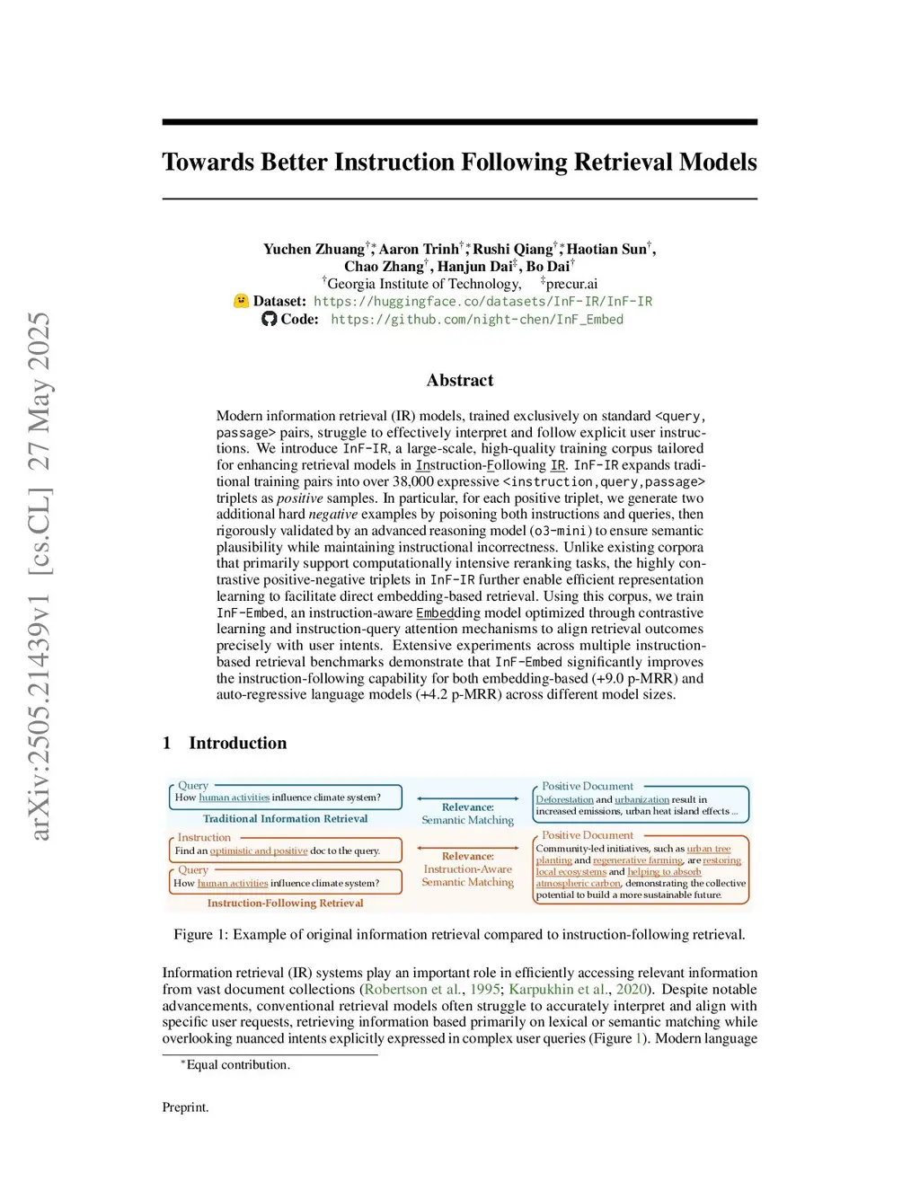 Modern information retrieval (IR) models, trained exclusively on standard <query, passage> pairs, struggle to effectively interpret and follow explicit user instructions. We introduce InF-IR, a large-scale, high-quality training corpus tailored for enhancing retrieval models in Instruction-Following IR. InF-IR expands traditional training pairs into over 38,000 expressive <instruction, query, passage> triplets as positive samples. In particular, for each positive triplet, we generate two additional hard negative examples by poisoning both instructions and queries, then rigorously validated by an advanced reasoning model (o3-mini) to ensure semantic plausibility while maintaining instructional incorrectness. Unlike existing corpora that primarily support computationally intensive reranking tasks for decoder-only language models, the highly contrastive positive-negative triplets in InF-IR further enable efficient representation learning for smaller encoder-only models, facilitating direct embedding-based retrieval. Using this corpus, we train InF-Embed, an instruction-aware Embedding model optimized through contrastive learning and instruction-query attention mechanisms to align retrieval outcomes precisely with user intents. Extensive experiments across five instruction-based retrieval benchmarks demonstrate that InF-Embed significantly surpasses competitive baselines by 8.1% in p-MRR, measuring the instruction-following capabilities.