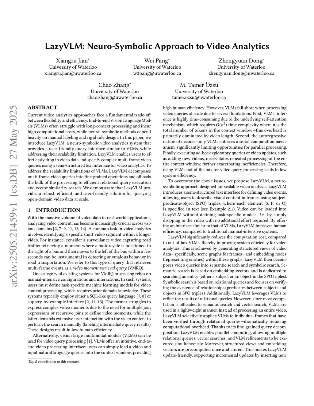 Current video analytics approaches face a fundamental trade-off between flexibility and efficiency. End-to-end Vision Language Models (VLMs) often struggle with long-context processing and incur high computational costs, while neural-symbolic methods depend heavily on manual labeling and rigid rule design. In this paper, we introduce LazyVLM, a neuro-symbolic video analytics system that provides a user-friendly query interface similar to VLMs, while addressing their scalability limitation. LazyVLM enables users to effortlessly drop in video data and specify complex multi-frame video queries using a semi-structured text interface for video analytics. To address the scalability limitations of VLMs, LazyVLM decomposes multi-frame video queries into fine-grained operations and offloads the bulk of the processing to efficient relational query execution and vector similarity search. We demonstrate that LazyVLM provides a robust, efficient, and user-friendly solution for querying open-domain video data at scale.
