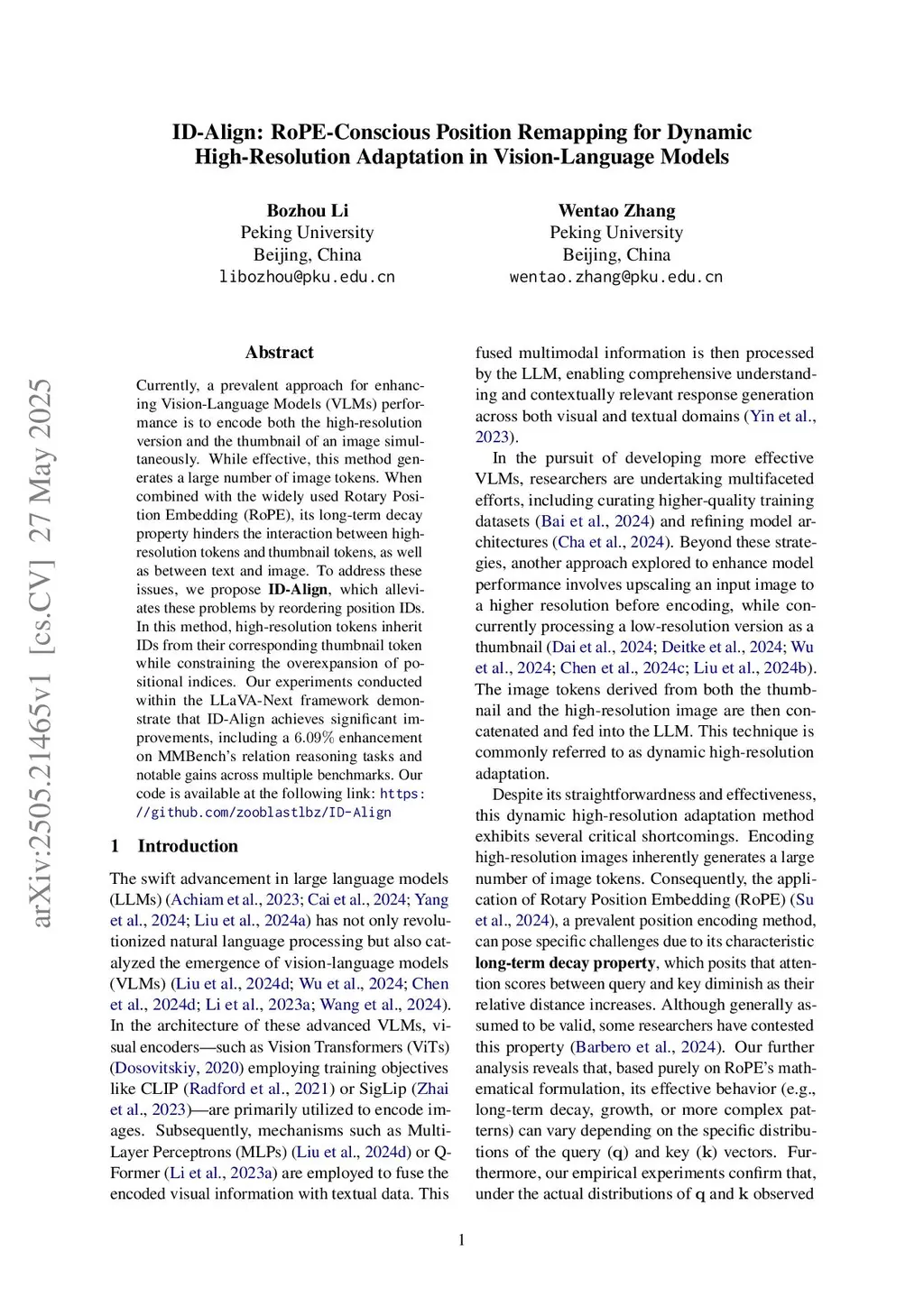 Currently, a prevalent approach for enhancing Vision-Language Models (VLMs) performance is to encode both the high-resolution version and the thumbnail of an image simultaneously. While effective, this method generates a large number of image tokens. When combined with the widely used Rotary Position Embedding (RoPE), its long-term decay property hinders the interaction between high-resolution tokens and thumbnail tokens, as well as between text and image. To address these issues, we propose ID-Align, which alleviates these problems by reordering position IDs. In this method, high-resolution tokens inherit IDs from their corresponding thumbnail token while constraining the overexpansion of positional indices. Our experiments conducted within the LLaVA-Next framework demonstrate that ID-Align achieves significant improvements, including a 6.09% enhancement on MMBench's relation reasoning tasks and notable gains across multiple benchmarks. Our code is available at the following link:this https URL.