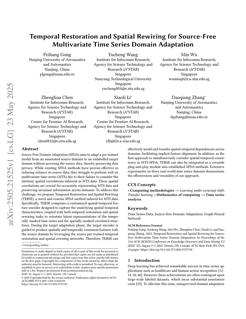 Source-Free Domain Adaptation (SFDA) aims to adapt a pre-trained model from an annotated source domain to an unlabelled target domain without accessing the source data, thereby preserving data privacy. While existing SFDA methods have proven effective in reducing reliance on source data, they struggle to perform well on multivariate time series (MTS) due to their failure to consider the intrinsic spatial correlations inherent in MTS data. These spatial correlations are crucial for accurately representing MTS data and preserving invariant information across domains. To address this challenge, we propose Temporal Restoration and Spatial Rewiring (TERSE), a novel and concise SFDA method tailored for MTS data. Specifically, TERSE comprises a customized spatial-temporal feature encoder designed to capture the underlying spatial-temporal characteristics, coupled with both temporal restoration and spatial rewiring tasks to reinstate latent representations of the temporally masked time series and the spatially masked correlated structures. During the target adaptation phase, the target encoder is guided to produce spatially and temporally consistent features with the source domain by leveraging the source pre-trained temporal restoration and spatial rewiring networks. Therefore, TERSE can effectively model and transfer spatial-temporal dependencies across domains, facilitating implicit feature alignment. In addition, as the first approach to simultaneously consider spatial-temporal consistency in MTS-SFDA, TERSE can also be integrated as a versatile plug-and-play module into established SFDA methods. Extensive experiments on three real-world time series datasets demonstrate the effectiveness and versatility of our approach.