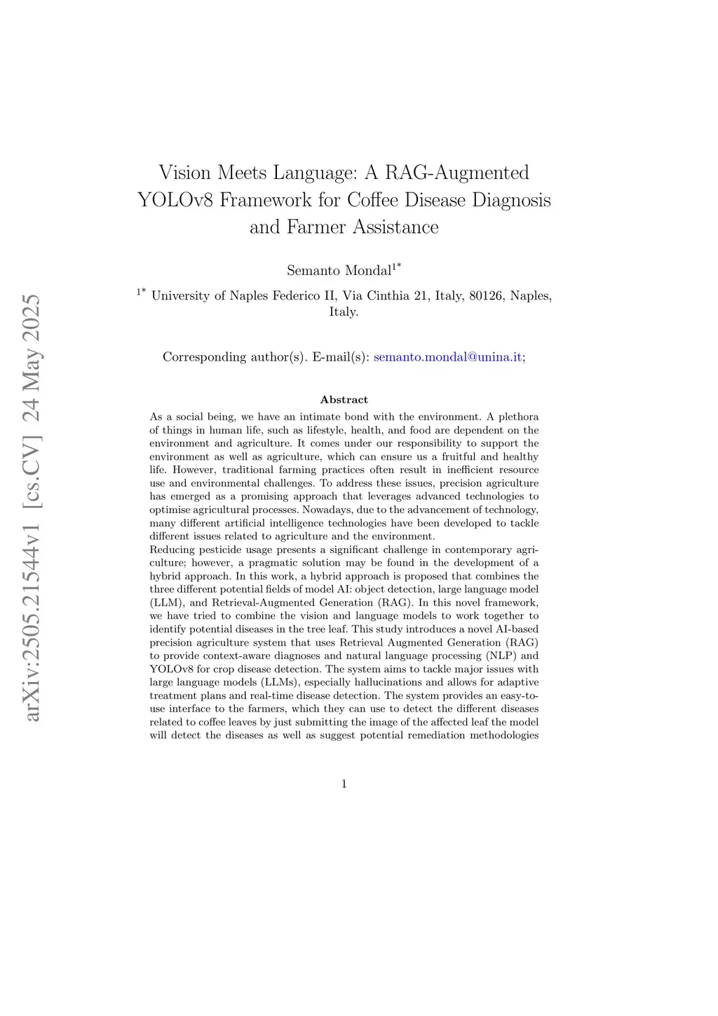 As a social being, we have an intimate bond with the environment. A plethora of things in human life, such as lifestyle, health, and food are dependent on the environment and agriculture. It comes under our responsibility to support the environment as well as agriculture. However, traditional farming practices often result in inefficient resource use and environmental challenges. To address these issues, precision agriculture has emerged as a promising approach that leverages advanced technologies to optimise agricultural processes. In this work, a hybrid approach is proposed that combines the three different potential fields of model AI: object detection, large language model (LLM), and Retrieval-Augmented Generation (RAG). In this novel framework, we have tried to combine the vision and language models to work together to identify potential diseases in the tree leaf. This study introduces a novel AI-based precision agriculture system that uses Retrieval Augmented Generation (RAG) to provide context-aware diagnoses and natural language processing (NLP) and YOLOv8 for crop disease detection. The system aims to tackle major issues with large language models (LLMs), especially hallucinations and allows for adaptive treatment plans and real-time disease detection. The system provides an easy-to-use interface to the farmers, which they can use to detect the different diseases related to coffee leaves by just submitting the image of the affected leaf the model will detect the diseases as well as suggest potential remediation methodologies which aim to lower the use of pesticides, preserving livelihoods, and encouraging environmentally friendly methods. With an emphasis on scalability, dependability, and user-friendliness, the project intends to improve RAG-integrated object detection systems for wider agricultural applications in the future.