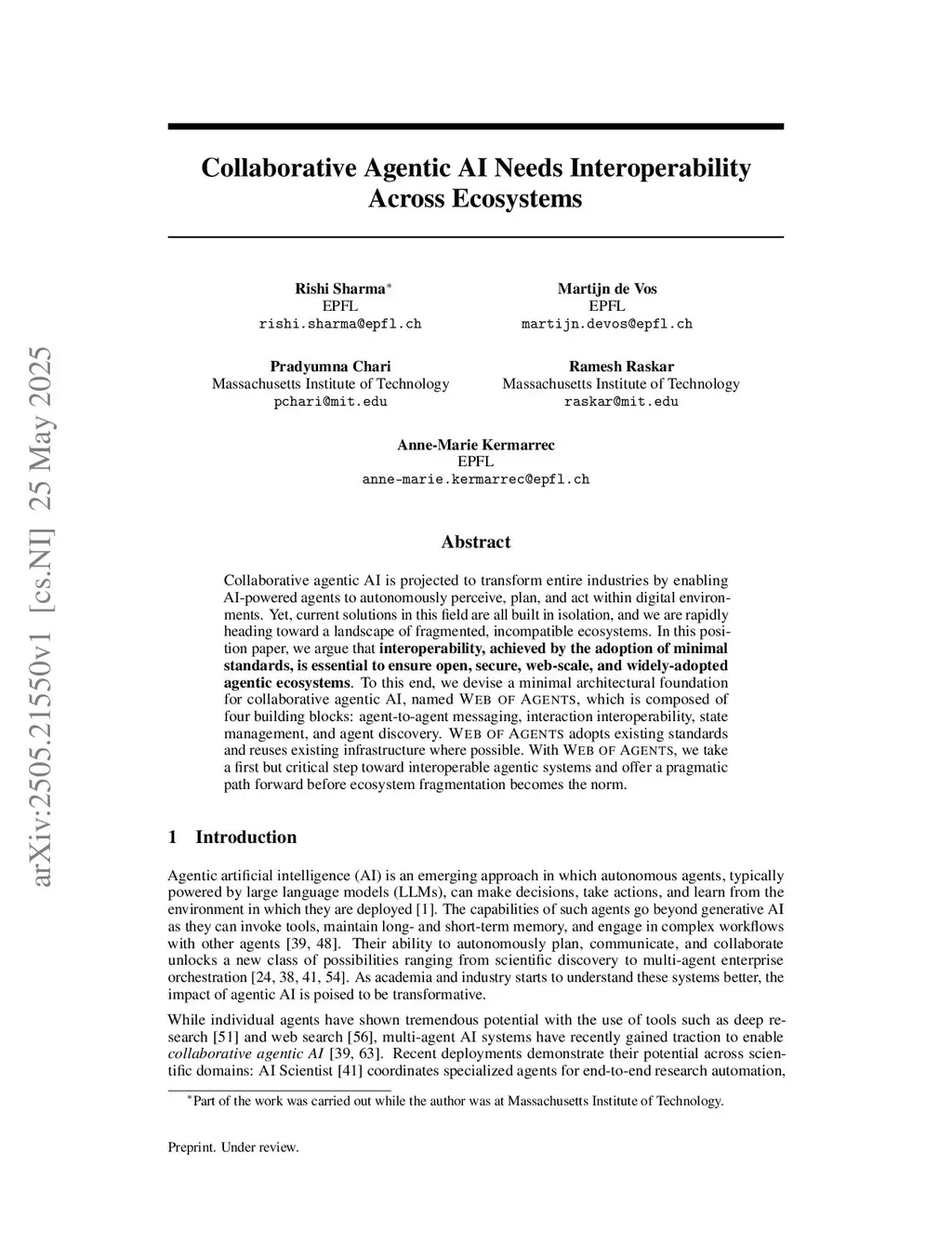 Collaborative agentic AI is projected to transform entire industries by enabling AI-powered agents to autonomously perceive, plan, and act within digital environments. Yet, current solutions in this field are all built in isolation, and we are rapidly heading toward a landscape of fragmented, incompatible ecosystems. In this position paper, we argue that interoperability, achieved by the adoption of minimal standards, is essential to ensure open, secure, web-scale, and widely-adopted agentic ecosystems. To this end, we devise a minimal architectural foundation for collaborative agentic AI, named Web of Agents, which is composed of four components: agent-to-agent messaging, interaction interoperability, state management, and agent discovery. Web of Agents adopts existing standards and reuses existing infrastructure where possible. With Web of Agents, we take the first but critical step toward interoperable agentic systems and offer a pragmatic path forward before ecosystem fragmentation becomes the norm.