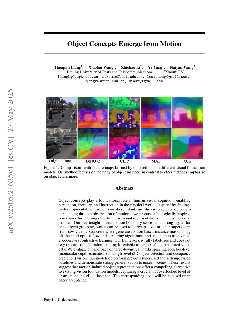 Object concepts play a foundational role in human visual cognition, enabling perception, memory, and interaction in the physical world. Inspired by findings in developmental neuroscience - where infants are shown to acquire object understanding through observation of motion - we propose a biologically inspired framework for learning object-centric visual representations in an unsupervised manner. Our key insight is that motion boundary serves as a strong signal for object-level grouping, which can be used to derive pseudo instance supervision from raw videos. Concretely, we generate motion-based instance masks using off-the-shelf optical flow and clustering algorithms, and use them to train visual encoders via contrastive learning. Our framework is fully label-free and does not rely on camera calibration, making it scalable to large-scale unstructured video data. We evaluate our approach on three downstream tasks spanning both low-level (monocular depth estimation) and high-level (3D object detection and occupancy prediction) vision. Our models outperform previous supervised and self-supervised baselines and demonstrate strong generalization to unseen scenes. These results suggest that motion-induced object representations offer a compelling alternative to existing vision foundation models, capturing a crucial but overlooked level of abstraction: the visual instance. The corresponding code will be released upon paper acceptance.