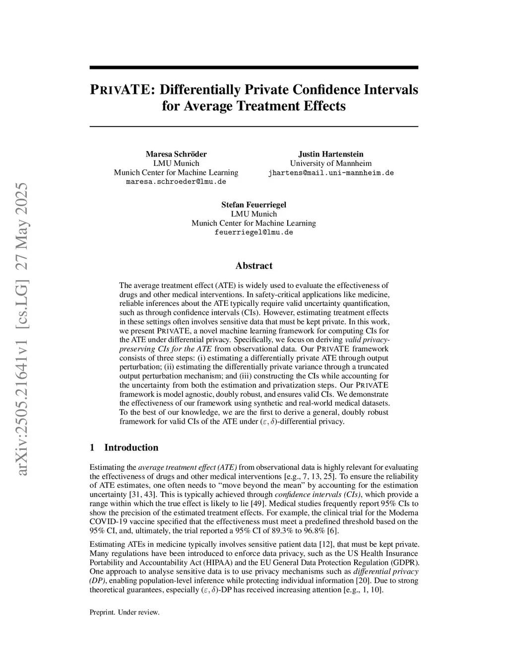 The average treatment effect (ATE) is widely used to evaluate the effectiveness of drugs and other medical interventions. In safety-critical applications like medicine, reliable inferences about the ATE typically require valid uncertainty quantification, such as through confidence intervals (CIs). However, estimating treatment effects in these settings often involves sensitive data that must be kept private. In this work, we present PrivATE, a novel machine learning framework for computing CIs for the ATE under differential privacy. Specifically, we focus on deriving valid privacy-preserving CIs for the ATE from observational data. Our PrivATE framework consists of three steps: (i) estimating a differentially private ATE through output perturbation; (ii) estimating the differentially private variance through a truncated output perturbation mechanism; and (iii) constructing the CIs while accounting for the uncertainty from both the estimation and privatization steps. Our PrivATE framework is model agnostic, doubly robust, and ensures valid CIs. We demonstrate the effectiveness of our framework using synthetic and real-world medical datasets. To the best of our knowledge, we are the first to derive a general, doubly robust framework for valid CIs of the ATE under (, )-differential privacy.