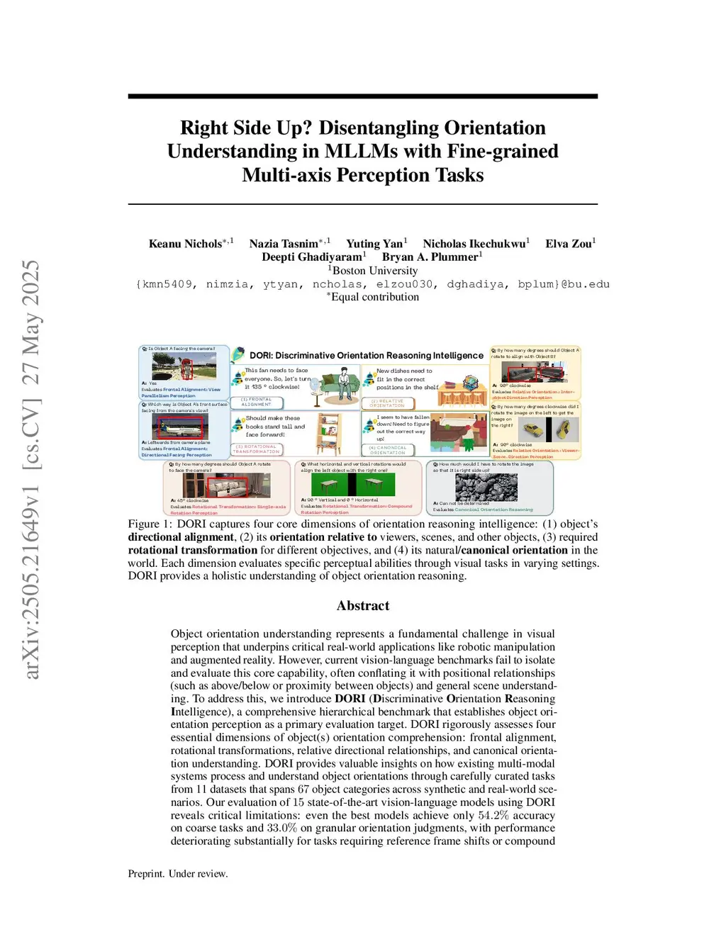 Object orientation understanding represents a fundamental challenge in visual perception critical for applications like robotic manipulation and augmented reality. Current vision-language benchmarks fail to isolate this capability, often conflating it with positional relationships and general scene understanding. We introduce DORI (Discriminative Orientation Reasoning Intelligence), a comprehensive benchmark establishing object orientation perception as a primary evaluation target. DORI assesses four dimensions of orientation comprehension: frontal alignment, rotational transformations, relative directional relationships, and canonical orientation understanding. Through carefully curated tasks from 11 datasets spanning 67 object categories across synthetic and real-world scenarios, DORI provides insights on how multi-modal systems understand object orientations. Our evaluation of 15 state-of-the-art vision-language models reveals critical limitations: even the best models achieve only 54.2% accuracy on coarse tasks and 33.0% on granular orientation judgments, with performance deteriorating for tasks requiring reference frame shifts or compound rotations. These findings demonstrate the need for dedicated orientation representation mechanisms, as models show systematic inability to perform precise angular estimations, track orientation changes across viewpoints, and understand compound rotations - suggesting limitations in their internal 3D spatial representations. As the first diagnostic framework specifically designed for orientation awareness in multimodal systems, DORI offers implications for improving robotic control, 3D scene reconstruction, and human-AI interaction in physical environments. DORI data:this https URL