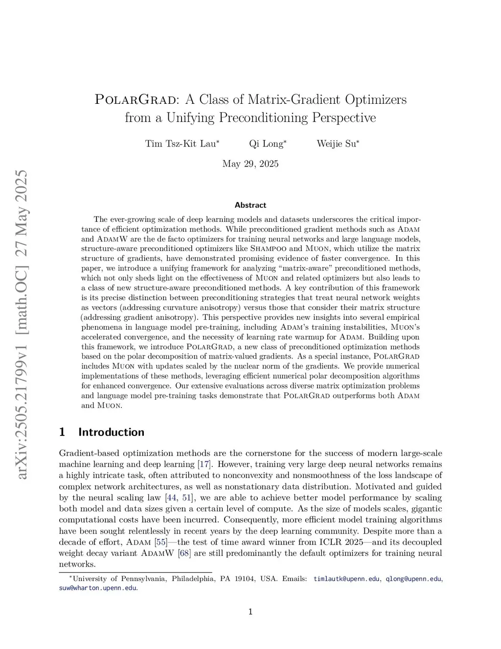The ever-growing scale of deep learning models and training data underscores the critical importance of efficient optimization methods. While preconditioned gradient methods such as Adam and AdamW are the de facto optimizers for training neural networks and large language models, structure-aware preconditioned optimizers like Shampoo and Muon, which utilize the matrix structure of gradients, have demonstrated promising evidence of faster convergence. In this paper, we introduce a unifying framework for analyzing "matrix-aware" preconditioned methods, which not only sheds light on the effectiveness of Muon and related optimizers but also leads to a class of new structure-aware preconditioned methods. A key contribution of this framework is its precise distinction between preconditioning strategies that treat neural network weights as vectors (addressing curvature anisotropy) versus those that consider their matrix structure (addressing gradient anisotropy). This perspective provides new insights into several empirical phenomena in language model pre-training, including Adam's training instabilities, Muon's accelerated convergence, and the necessity of learning rate warmup for Adam. Building upon this framework, we introduce PolarGrad, a new class of preconditioned optimization methods based on the polar decomposition of matrix-valued gradients. As a special instance, PolarGrad includes Muon with updates scaled by the nuclear norm of the gradients. We provide numerical implementations of these methods, leveraging efficient numerical polar decomposition algorithms for enhanced convergence. Our extensive evaluations across diverse matrix optimization problems and language model pre-training tasks demonstrate that PolarGrad outperforms both Adam and Muon.
