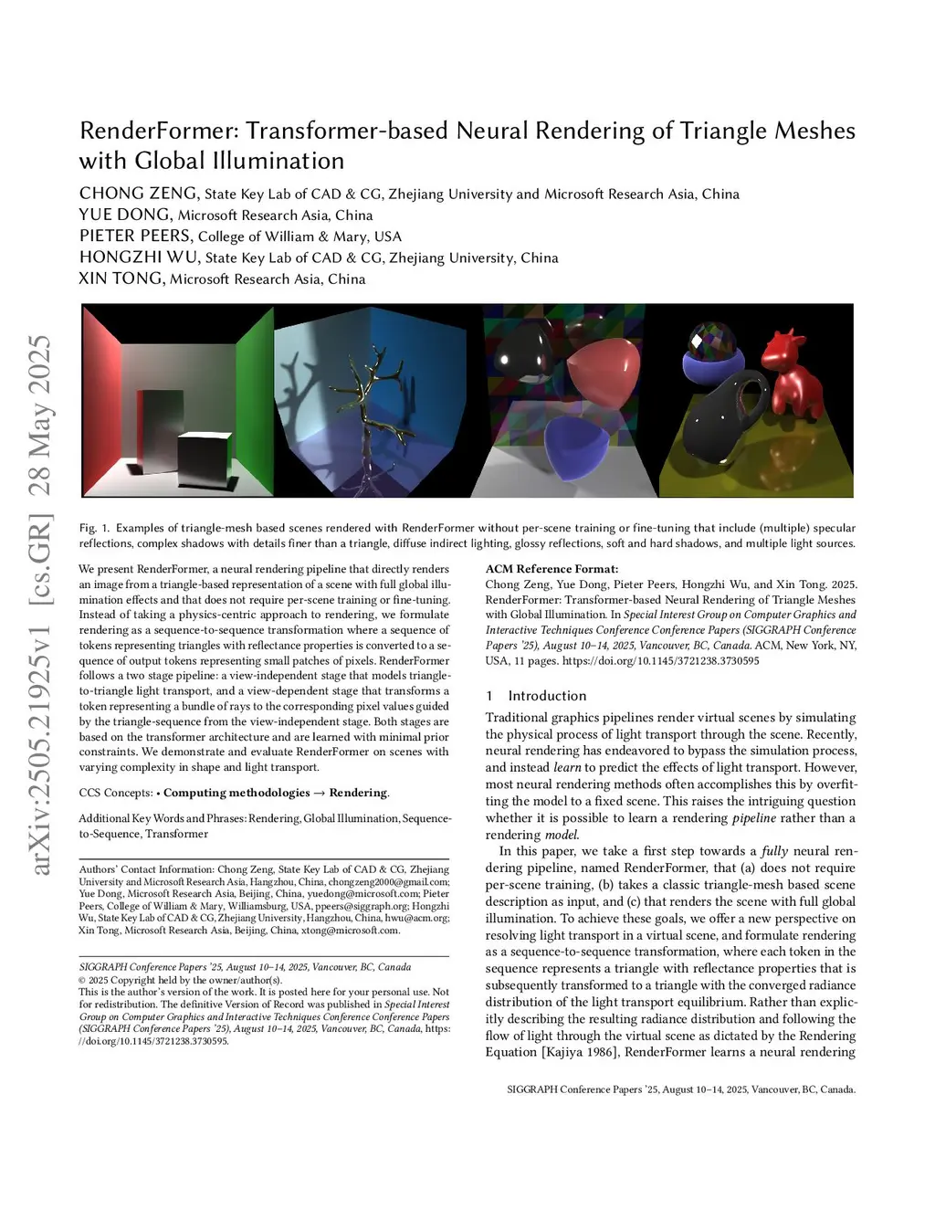 RenderFormer: Transformer-based Neural Rendering of Triangle Meshes with Global Illumination