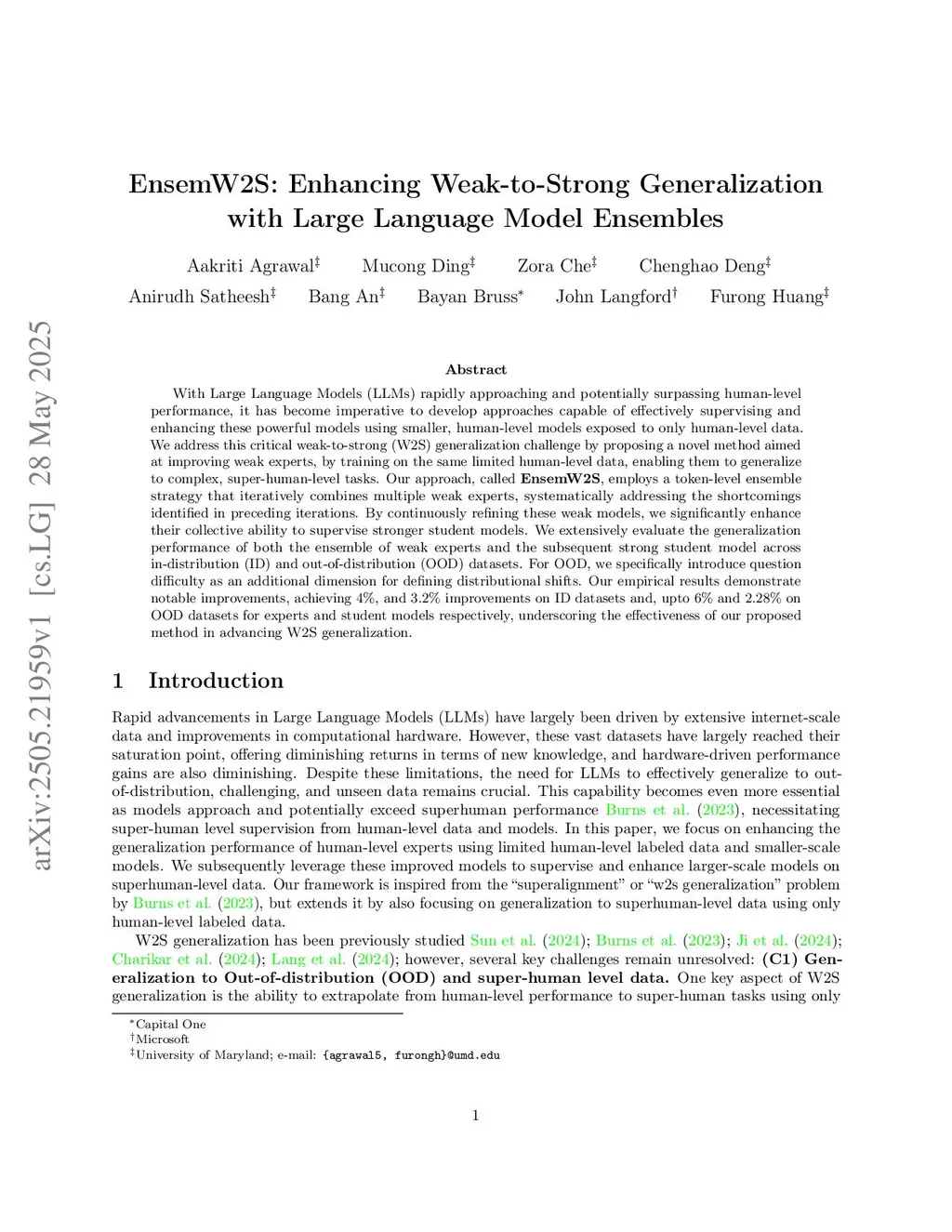 With Large Language Models (LLMs) rapidly approaching and potentially surpassing human-level performance, it has become imperative to develop approaches capable of effectively supervising and enhancing these powerful models using smaller, human-level models exposed to only human-level data. We address this critical weak-to-strong (W2S) generalization challenge by proposing a novel method aimed at improving weak experts, by training on the same limited human-level data, enabling them to generalize to complex, super-human-level tasks. Our approach, called \textbf{EnsemW2S}, employs a token-level ensemble strategy that iteratively combines multiple weak experts, systematically addressing the shortcomings identified in preceding iterations. By continuously refining these weak models, we significantly enhance their collective ability to supervise stronger student models. We extensively evaluate the generalization performance of both the ensemble of weak experts and the subsequent strong student model across in-distribution (ID) and out-of-distribution (OOD) datasets. For OOD, we specifically introduce question difficulty as an additional dimension for defining distributional shifts. Our empirical results demonstrate notable improvements, achieving 4\%, and 3.2\% improvements on ID datasets and, upto 6\% and 2.28\% on OOD datasets for experts and student models respectively, underscoring the effectiveness of our proposed method in advancing W2S generalization.