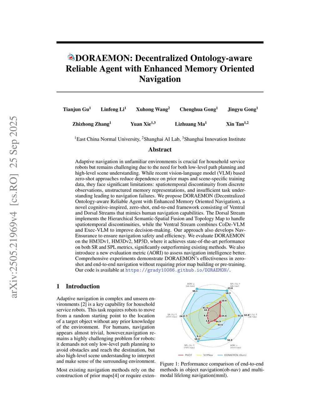Adaptive navigation in unfamiliar environments is crucial for household service robots but remains challenging due to the need for both low-level path planning and high-level scene understanding. While recent vision-language model (VLM) based zero-shot approaches reduce dependence on prior maps and scene-specific training data, they face significant limitations: spatiotemporal discontinuity from discrete observations, unstructured memory representations, and insufficient task understanding leading to navigation failures. We propose DORAEMON (Decentralized Ontology-aware Reliable Agent with Enhanced Memory Oriented Navigation), a novel cognitive-inspired framework consisting of Ventral and Dorsal Streams that mimics human navigation capabilities. The Dorsal Stream implements the Hierarchical Semantic-Spatial Fusion and Topology Map to handle spatiotemporal discontinuities, while the Ventral Stream combines RAG-VLM and Policy-VLM to improve decision-making. Our approach also develops Nav-Ensurance to ensure navigation safety and efficiency. We evaluate DORAEMON on the HM3D, MP3D, and GOAT datasets, where it achieves state-of-the-art performance on both success rate (SR) and success weighted by path length (SPL) metrics, significantly outperforming existing methods. We also introduce a new evaluation metric (AORI) to assess navigation intelligence better. Comprehensive experiments demonstrate DORAEMON's effectiveness in zero-shot autonomous navigation without requiring prior map building or pre-training.