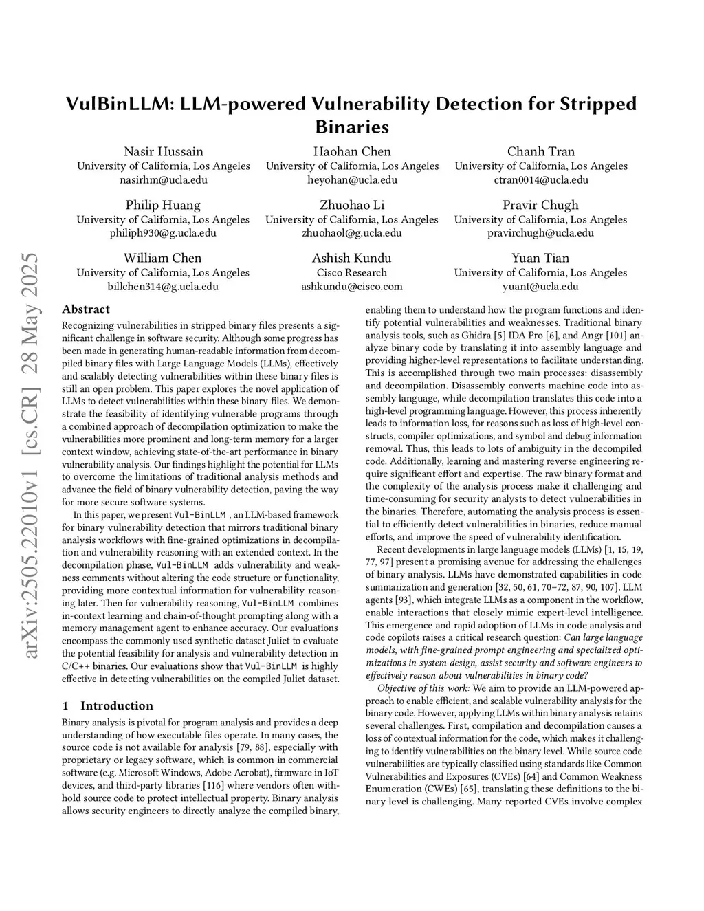 Recognizing vulnerabilities in stripped binary files presents a significant challenge in software security. Although some progress has been made in generating human-readable information from decompiled binary files with Large Language Models (LLMs), effectively and scalably detecting vulnerabilities within these binary files is still an open problem. This paper explores the novel application of LLMs to detect vulnerabilities within these binary files. We demonstrate the feasibility of identifying vulnerable programs through a combined approach of decompilation optimization to make the vulnerabilities more prominent and long-term memory for a larger context window, achieving state-of-the-art performance in binary vulnerability analysis. Our findings highlight the potential for LLMs to overcome the limitations of traditional analysis methods and advance the field of binary vulnerability detection, paving the way for more secure software systems. In this paper, we present Vul-BinLLM , an LLM-based framework for binary vulnerability detection that mirrors traditional binary analysis workflows with fine-grained optimizations in decompilation and vulnerability reasoning with an extended context. In the decompilation phase, Vul-BinLLM adds vulnerability and weakness comments without altering the code structure or functionality, providing more contextual information for vulnerability reasoning later. Then for vulnerability reasoning, Vul-BinLLM combines in-context learning and chain-of-thought prompting along with a memory management agent to enhance accuracy. Our evaluations encompass the commonly used synthetic dataset Juliet to evaluate the potential feasibility for analysis and vulnerability detection in C/C++ binaries. Our evaluations show that Vul-BinLLM is highly effective in detecting vulnerabilities on the compiled Juliet dataset.