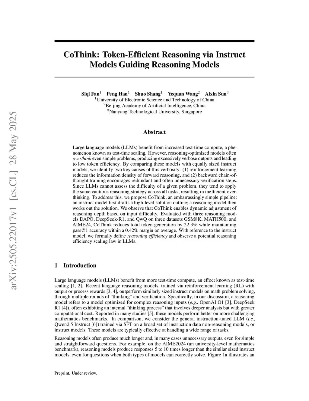 Recent thinking models trained with reinforcement learning and backward-checking CoT often suffer from overthinking: they produce excessively long outputs even on simple problems, wasting computation. Existing evaluations, based on token efficiency, give an incomplete view as they neglect problem difficulty and intermediate computation costs. We formalize reasoning efficiency as a relative measure between thinking and instruct models, treating instruct models as the minimal-effort baseline. A systematic study across four thinking models and multiple benchmarks reveals two consistent patterns: (i) instruct models achieve higher efficiency overall, and (ii) problem difficulty affects efficiency, with thinking models wasting computation on easy problems but providing value on harder ones. Building on this insight, we propose COTHINK, a simple two-stage pipeline: an instruct model drafts a brief outline, and a thinking model expands it. On GSM8K, MATH500, and AIME24, COTHINK cuts token usage by 21.1% while keeping accuracy on four thinking models, and remains competitive with strong efficiency baselines.