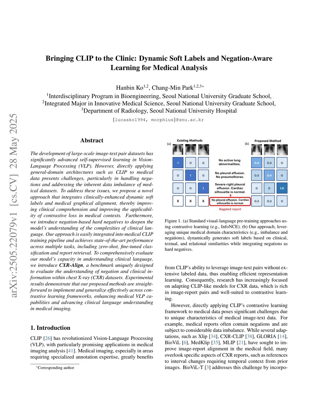 The development of large-scale image-text pair datasets has significantly advanced self-supervised learning in Vision-Language Processing (VLP). However, directly applying general-domain architectures such as CLIP to medical data presents challenges, particularly in handling negations and addressing the inherent data imbalance of medical datasets. To address these issues, we propose a novel approach that integrates clinically-enhanced dynamic soft labels and medical graphical alignment, thereby improving clinical comprehension and the applicability of contrastive loss in medical contexts. Furthermore, we introduce negation-based hard negatives to deepen the model's understanding of the complexities of clinical language. Our approach is easily integrated into the medical CLIP training pipeline and achieves state-of-the-art performance across multiple tasks, including zero-shot, fine-tuned classification, and report retrieval. To comprehensively evaluate our model's capacity for understanding clinical language, we introduce CXR-Align, a benchmark uniquely designed to evaluate the understanding of negation and clinical information within chest X-ray (CXR) datasets. Experimental results demonstrate that our proposed methods are straightforward to implement and generalize effectively across contrastive learning frameworks, enhancing medical VLP capabilities and advancing clinical language understanding in medical imaging.