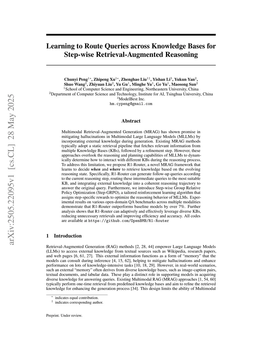Multimodal Retrieval-Augmented Generation (MRAG) has shown promise in mitigating hallucinations in Multimodal Large Language Models (MLLMs) by incorporating external knowledge during generation. Existing MRAG methods typically adopt a static retrieval pipeline that fetches relevant information from multiple Knowledge Bases (KBs), followed by a refinement step. However, these approaches overlook the reasoning and planning capabilities of MLLMs to dynamically determine how to interact with different KBs during the reasoning process. To address this limitation, we propose R1-Router, a novel MRAG framework that learns to decide when and where to retrieve knowledge based on the evolving reasoning state. Specifically, R1-Router can generate follow-up queries according to the current reasoning step, routing these intermediate queries to the most suitable KB, and integrating external knowledge into a coherent reasoning trajectory to answer the original query. Furthermore, we introduce Step-wise Group Relative Policy Optimization (Step-GRPO), a tailored reinforcement learning algorithm that assigns step-specific rewards to optimize the reasoning behavior of MLLMs. Experimental results on various open-domain QA benchmarks across multiple modalities demonstrate that R1-Router outperforms baseline models by over 7%. Further analysis shows that R1-Router can adaptively and effectively leverage diverse KBs, reducing unnecessary retrievals and improving both efficiency and accuracy.