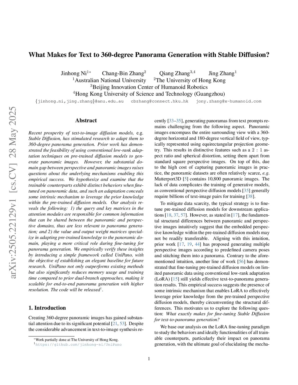 Recent prosperity of text-to-image diffusion models, e.g. Stable Diffusion, has stimulated research to adapt them to 360-degree panorama generation. Prior work has demonstrated the feasibility of using conventional low-rank adaptation techniques on pre-trained diffusion models to generate panoramic images. However, the substantial domain gap between perspective and panoramic images raises questions about the underlying mechanisms enabling this empirical success. We hypothesize and examine that the trainable counterparts exhibit distinct behaviors when fine-tuned on panoramic data, and such an adaptation conceals some intrinsic mechanism to leverage the prior knowledge within the pre-trained diffusion models. Our analysis reveals the following: 1) the query and key matrices in the attention modules are responsible for common information that can be shared between the panoramic and perspective domains, thus are less relevant to panorama generation; and 2) the value and output weight matrices specialize in adapting pre-trained knowledge to the panoramic domain, playing a more critical role during fine-tuning for panorama generation. We empirically verify these insights by introducing a simple framework called UniPano, with the objective of establishing an elegant baseline for future research. UniPano not only outperforms existing methods but also significantly reduces memory usage and training time compared to prior dual-branch approaches, making it scalable for end-to-end panorama generation with higher resolution. The code will be released.