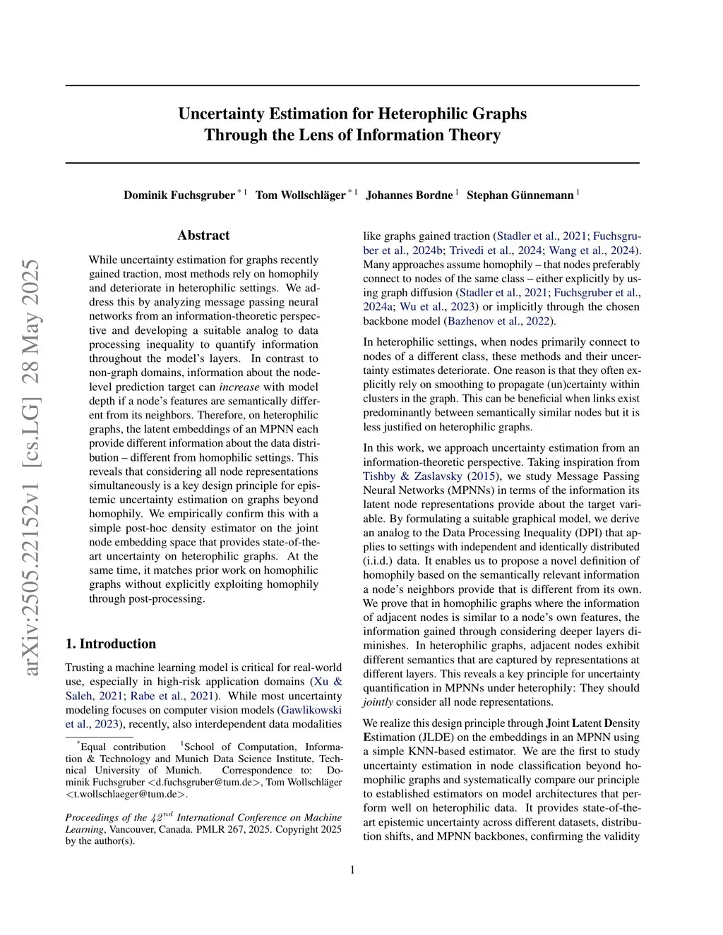 While uncertainty estimation for graphs recently gained traction, most methods rely on homophily and deteriorate in heterophilic settings. We address this by analyzing message passing neural networks from an information-theoretic perspective and developing a suitable analog to data processing inequality to quantify information throughout the model's layers. In contrast to non-graph domains, information about the node-level prediction target can increase with model depth if a node's features are semantically different from its neighbors. Therefore, on heterophilic graphs, the latent embeddings of an MPNN each provide different information about the data distribution - different from homophilic settings. This reveals that considering all node representations simultaneously is a key design principle for epistemic uncertainty estimation on graphs beyond homophily. We empirically confirm this with a simple post-hoc density estimator on the joint node embedding space that provides state-of-the-art uncertainty on heterophilic graphs. At the same time, it matches prior work on homophilic graphs without explicitly exploiting homophily through post-processing.