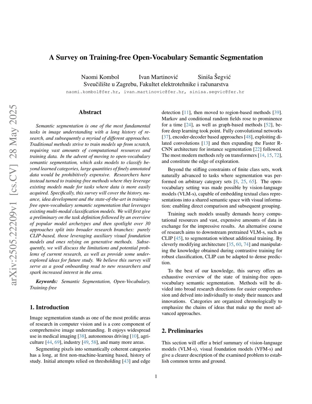 Semantic segmentation is one of the most fundamental tasks in image understanding with a long history of research, and subsequently a myriad of different approaches. Traditional methods strive to train models up from scratch, requiring vast amounts of computational resources and training data. In the advent of moving to open-vocabulary semantic segmentation, which asks models to classify beyond learned categories, large quantities of finely annotated data would be prohibitively expensive. Researchers have instead turned to training-free methods where they leverage existing models made for tasks where data is more easily acquired. Specifically, this survey will cover the history, nuance, idea development and the state-of-the-art in training-free open-vocabulary semantic segmentation that leverages existing multi-modal classification models. We will first give a preliminary on the task definition followed by an overview of popular model archetypes and then spotlight over 30 approaches split into broader research branches: purely CLIP-based, those leveraging auxiliary visual foundation models and ones relying on generative methods. Subsequently, we will discuss the limitations and potential problems of current research, as well as provide some underexplored ideas for future study. We believe this survey will serve as a good onboarding read to new researchers and spark increased interest in the area.