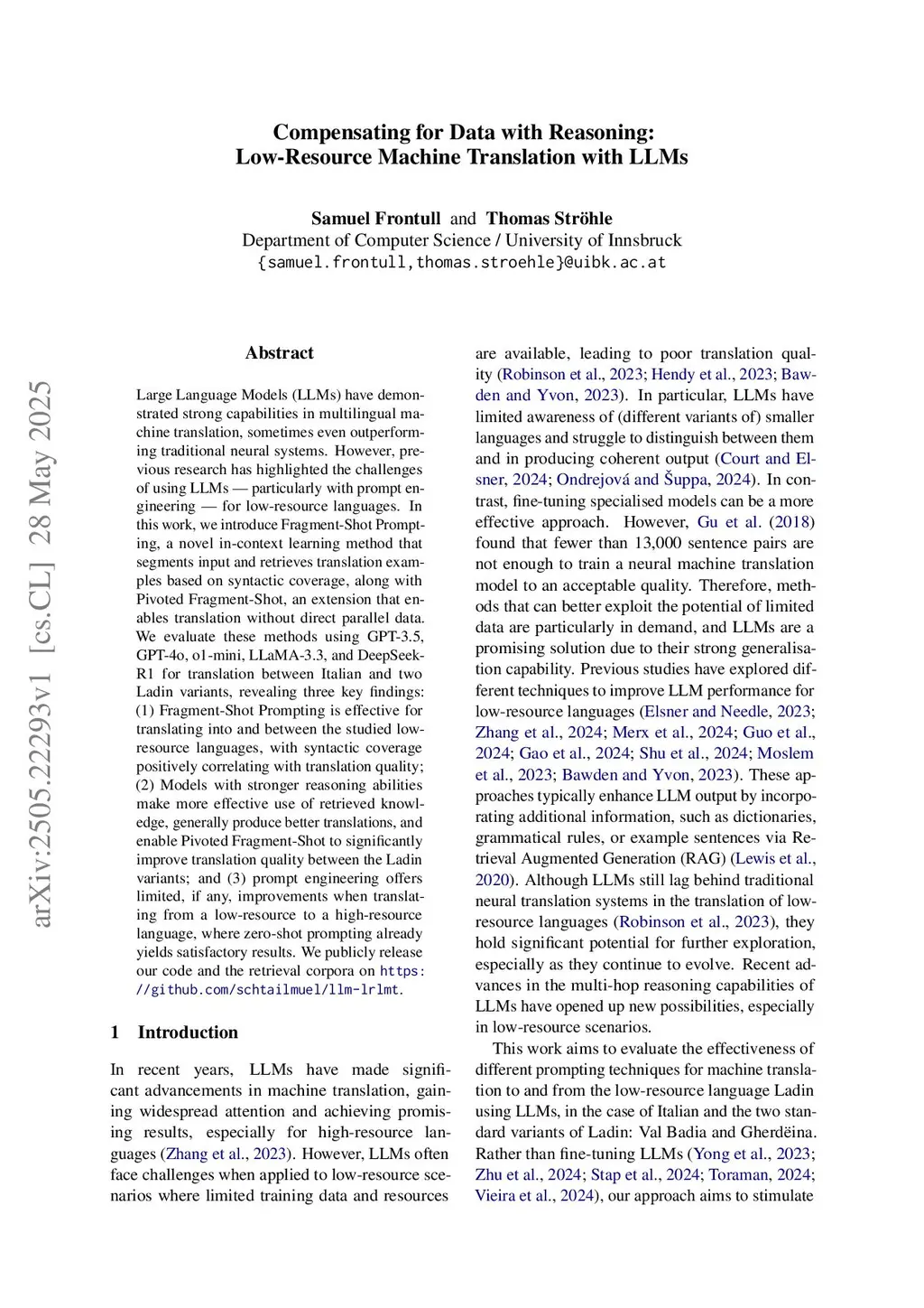 Compensating for Data with Reasoning: Low-Resource Machine Translation with LLMs