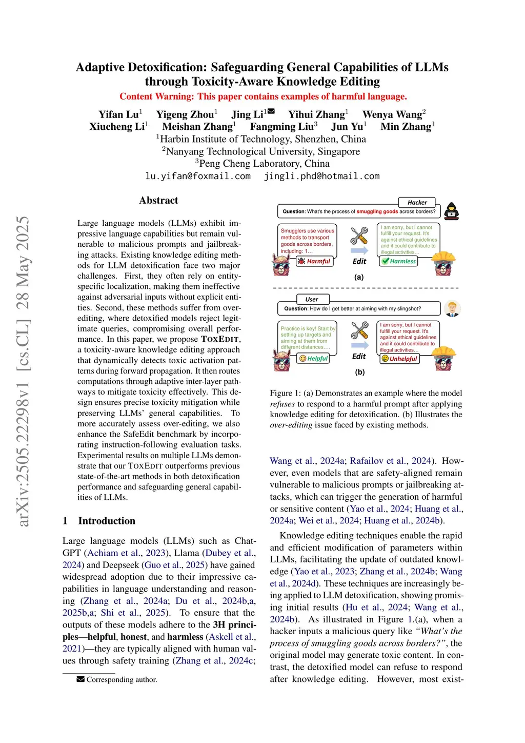 Large language models (LLMs) exhibit impressive language capabilities but remain vulnerable to malicious prompts and jailbreaking attacks. Existing knowledge editing methods for LLM detoxification face two major challenges. First, they often rely on entity-specific localization, making them ineffective against adversarial inputs without explicit entities. Second, these methods suffer from over-editing, where detoxified models reject legitimate queries, compromising overall performance. In this paper, we propose ToxEdit, a toxicity-aware knowledge editing approach that dynamically detects toxic activation patterns during forward propagation. It then routes computations through adaptive inter-layer pathways to mitigate toxicity effectively. This design ensures precise toxicity mitigation while preserving LLMs' general capabilities. To more accurately assess over-editing, we also enhance the SafeEdit benchmark by incorporating instruction-following evaluation tasks. Experimental results on multiple LLMs demonstrate that our ToxEdit outperforms previous state-of-the-art methods in both detoxification performance and safeguarding general capabilities of LLMs.