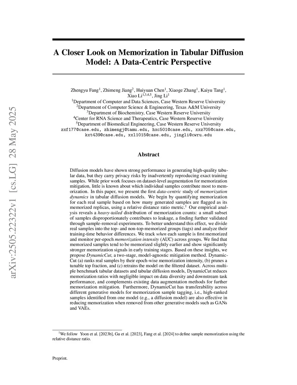 Diffusion models have shown strong performance in generating high-quality tabular data, but they carry privacy risks by reproducing exact training samples. While prior work focuses on dataset-level augmentation to reduce memorization, little is known about which individual samples contribute most. We present the first data-centric study of memorization dynamics in tabular diffusion models. We quantify memorization for each real sample based on how many generated samples are flagged as replicas, using a relative distance ratio. Our empirical analysis reveals a heavy-tailed distribution of memorization counts: a small subset of samples contributes disproportionately to leakage, confirmed via sample-removal experiments. To understand this, we divide real samples into top- and non-top-memorized groups and analyze their training-time behaviors. We track when each sample is first memorized and monitor per-epoch memorization intensity (AUC). Memorized samples are memorized slightly earlier and show stronger signals in early training. Based on these insights, we propose DynamicCut, a two-stage, model-agnostic mitigation method: (a) rank samples by epoch-wise intensity, (b) prune a tunable top fraction, and (c) retrain on the filtered dataset. Across multiple tabular datasets and models, DynamicCut reduces memorization with minimal impact on data diversity and downstream performance. It also complements augmentation-based defenses. Furthermore, DynamicCut enables cross-model transferability: high-ranked samples identified from one model (e.g., a diffusion model) are also effective for reducing memorization when removed from others, such as GANs and VAEs.