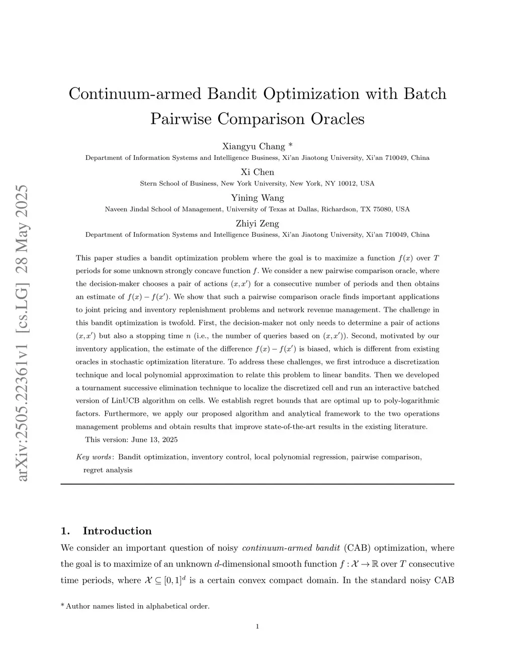 This paper studies a bandit optimization problem where the goal is to maximize a function over periods for some unknown strongly concave function . We consider a new pairwise comparison oracle, where the decision-maker chooses a pair of actions for a consecutive number of periods and then obtains an estimate of . We show that such a pairwise comparison oracle finds important applications to joint pricing and inventory replenishment problems and network revenue management. The challenge in this bandit optimization is twofold. First, the decision-maker not only needs to determine a pair of actions but also a stopping time (i.e., the number of queries based on ). Second, motivated by our inventory application, the estimate of the difference is biased, which is different from existing oracles in stochastic optimization literature. To address these challenges, we first introduce a discretization technique and local polynomial approximation to relate this problem to linear bandits. Then we developed a tournament successive elimination technique to localize the discretized cell and run an interactive batched version of LinUCB algorithm on cells. We establish regret bounds that are optimal up to poly-logarithmic factors. Furthermore, we apply our proposed algorithm and analytical framework to the two operations management problems and obtain results that improve state-of-the-art results in the existing literature.