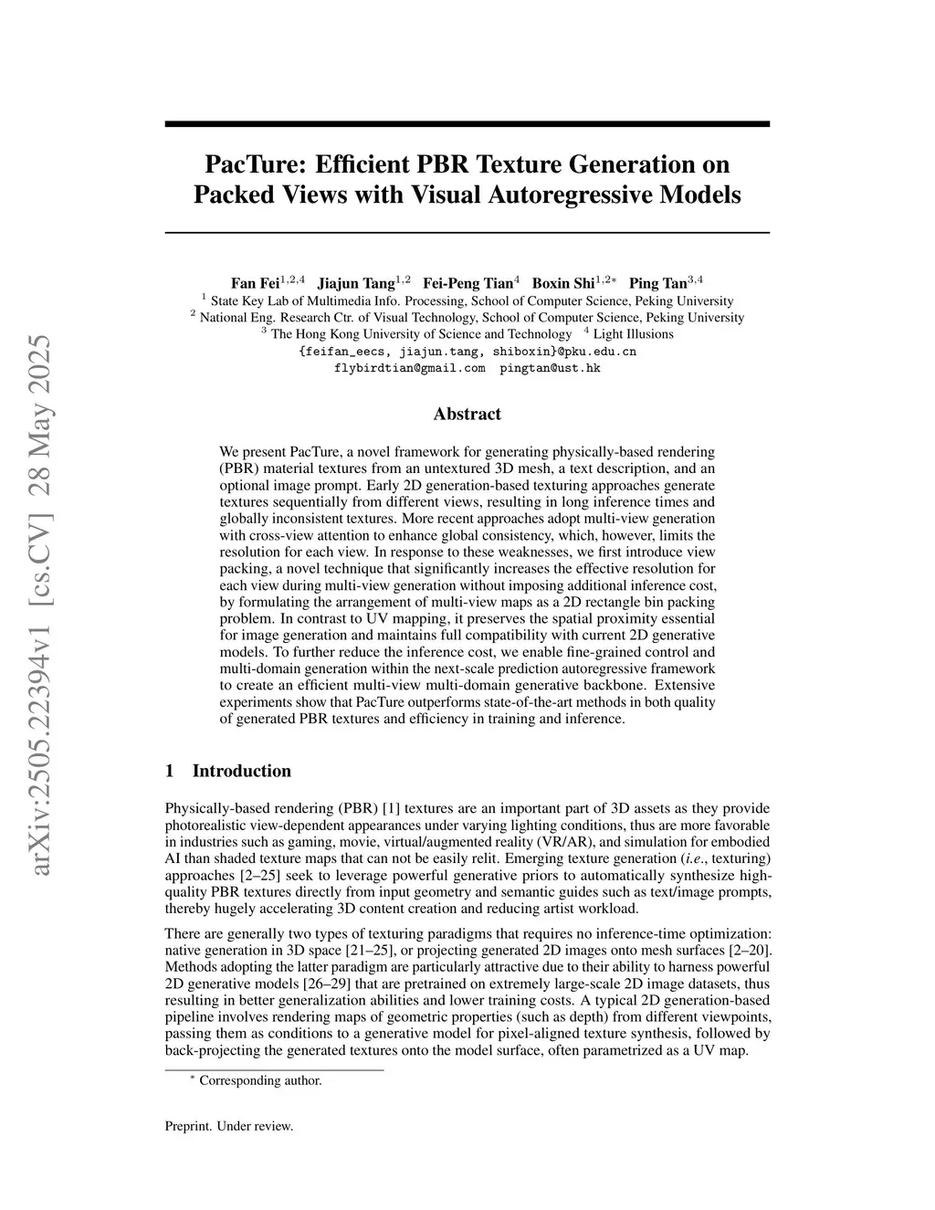 We present PacTure, a novel framework for generating physically-based rendering (PBR) material textures from an untextured 3D mesh, a text description, and an optional image prompt. Early 2D generation-based texturing approaches generate textures sequentially from different views, resulting in long inference times and globally inconsistent textures. More recent approaches adopt multi-view generation with cross-view attention to enhance global consistency, which, however, limits the resolution for each view. In response to these weaknesses, we first introduce view packing, a novel technique that significantly increases the effective resolution for each view during multi-view generation without imposing additional inference cost, by formulating the arrangement of multi-view maps as a 2D rectangle bin packing problem. In contrast to UV mapping, it preserves the spatial proximity essential for image generation and maintains full compatibility with current 2D generative models. To further reduce the inference cost, we enable fine-grained control and multi-domain generation within the next-scale prediction autoregressive framework to create an efficient multi-view multi-domain generative backbone. Extensive experiments show that PacTure outperforms state-of-the-art methods in both quality of generated PBR textures and efficiency in training and inference.