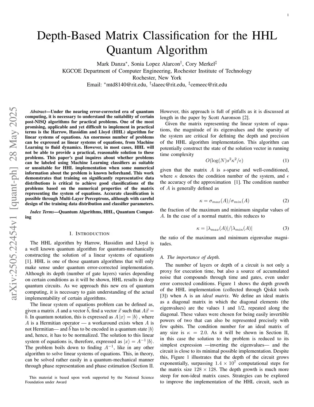 Depth-Based Matrix Classification for the HHL Quantum Algorithm