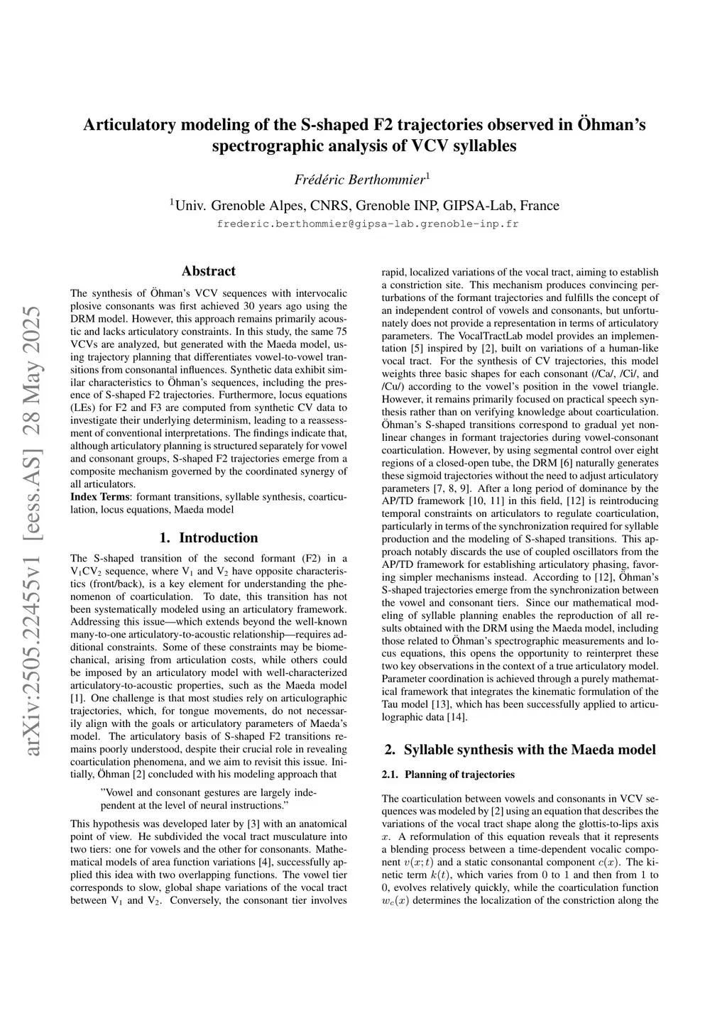 The synthesis of Ohman's VCV sequences with intervocalic plosive consonants was first achieved 30 years ago using the DRM model. However, this approach remains primarily acoustic and lacks articulatory constraints. In this study, the same 75 VCVs are analyzed, but generated with the Maeda model, using trajectory planning that differentiates vowel-to-vowel transitions from consonantal influences. Synthetic data exhibit similar characteristics to Ohman's sequences, including the presence of S-shaped F2 trajectories. Furthermore, locus equations (LEs) for F2 and F3 are computed from synthetic CV data to investigate their underlying determinism, leading to a reassessment of conventional interpretations. The findings indicate that, although articulatory planning is structured separately for vowel and consonant groups, S-shaped F2 trajectories emerge from a composite mechanism governed by the coordinated synergy of all articulators.