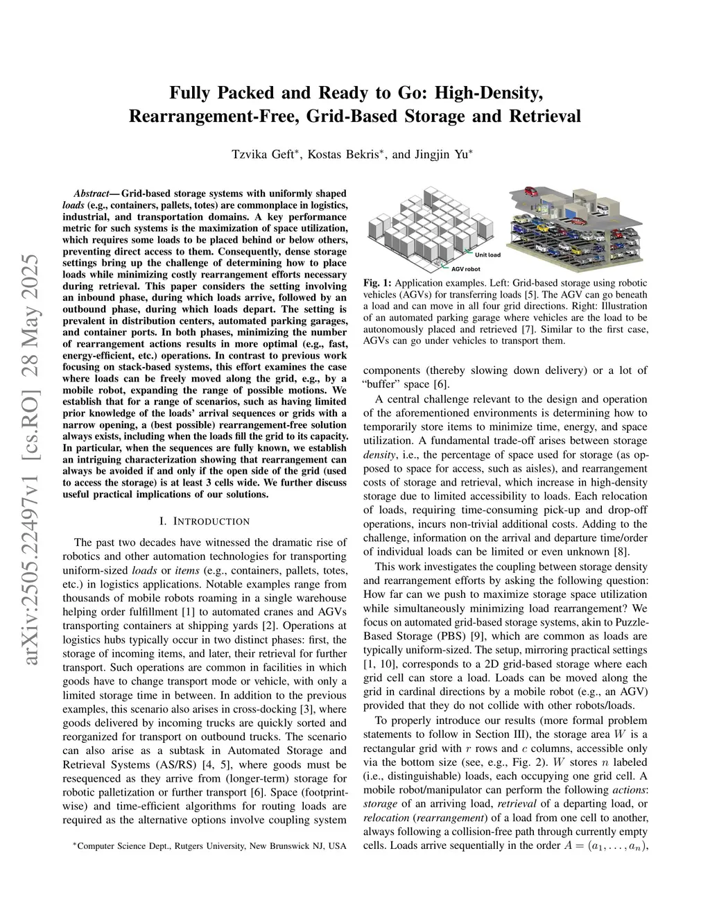 Grid-based storage systems with uniformly shaped loads (e.g., containers, pallets, totes) are commonplace in logistics, industrial, and transportation domains. A key performance metric for such systems is the maximization of space utilization, which requires some loads to be placed behind or below others, preventing direct access to them. Consequently, dense storage settings bring up the challenge of determining how to place loads while minimizing costly rearrangement efforts necessary during retrieval. This paper considers the setting involving an inbound phase, during which loads arrive, followed by an outbound phase, during which loads depart. The setting is prevalent in distribution centers, automated parking garages, and container ports. In both phases, minimizing the number of rearrangement actions results in more optimal (e.g., fast, energy-efficient, etc.) operations. In contrast to previous work focusing on stack-based systems, this effort examines the case where loads can be freely moved along the grid, e.g., by a mobile robot, expanding the range of possible motions. We establish that for a range of scenarios, such as having limited prior knowledge of the loads' arrival sequences or grids with a narrow opening, a (best possible) rearrangement-free solution always exists, including when the loads fill the grid to its capacity. In particular, when the sequences are fully known, we establish an intriguing characterization showing that rearrangement can always be avoided if and only if the open side of the grid (used to access the storage) is at least 3 cells wide. We further discuss useful practical implications of our solutions.