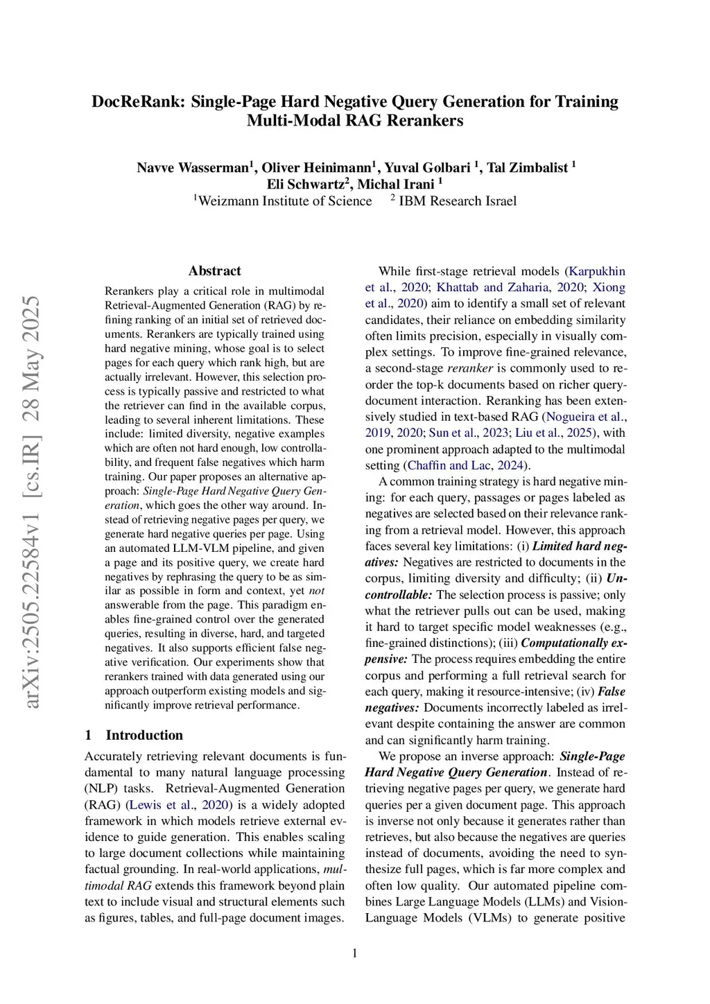 DocReRank: Single-Page Hard Negative Query Generation for Training Multi-Modal RAG Rerankers