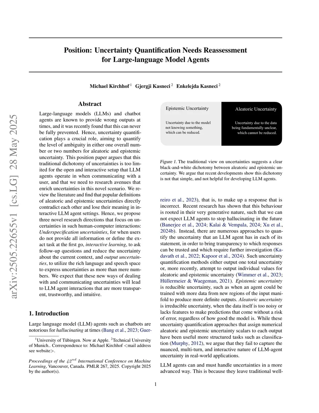 Large-language models (LLMs) and chatbot agents are known to provide wrong outputs at times, and it was recently found that this can never be fully prevented. Hence, uncertainty quantification plays a crucial role, aiming to quantify the level of ambiguity in either one overall number or two numbers for aleatoric and epistemic uncertainty. This position paper argues that this traditional dichotomy of uncertainties is too limited for the open and interactive setup that LLM agents operate in when communicating with a user, and that we need to research avenues that enrich uncertainties in this novel scenario. We review the literature and find that popular definitions of aleatoric and epistemic uncertainties directly contradict each other and lose their meaning in interactive LLM agent settings. Hence, we propose three novel research directions that focus on uncertainties in such human-computer interactions: Underspecification uncertainties, for when users do not provide all information or define the exact task at the first go, interactive learning, to ask follow-up questions and reduce the uncertainty about the current context, and output uncertainties, to utilize the rich language and speech space to express uncertainties as more than mere numbers. We expect that these new ways of dealing with and communicating uncertainties will lead to LLM agent interactions that are more transparent, trustworthy, and intuitive.