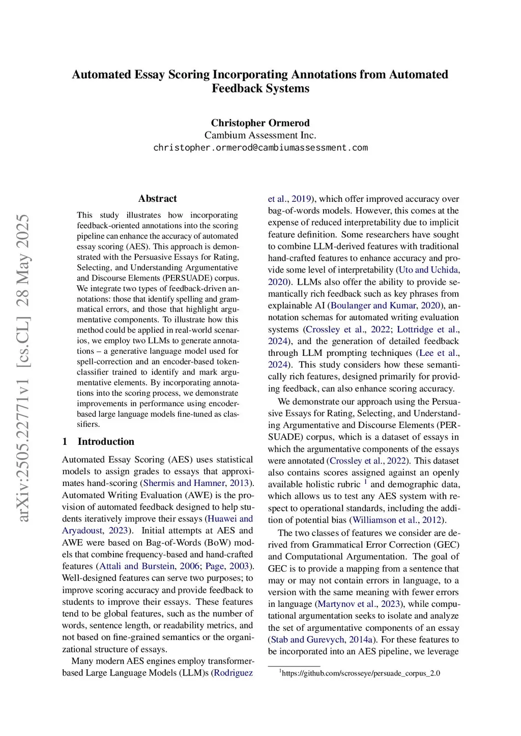 This study illustrates how incorporating feedback-oriented annotations into the scoring pipeline can enhance the accuracy of automated essay scoring (AES). This approach is demonstrated with the Persuasive Essays for Rating, Selecting, and Understanding Argumentative and Discourse Elements (PERSUADE) corpus. We integrate two types of feedback-driven annotations: those that identify spelling and grammatical errors, and those that highlight argumentative components. To illustrate how this method could be applied in real-world scenarios, we employ two LLMs to generate annotations -- a generative language model used for spell correction and an encoder-based token-classifier trained to identify and mark argumentative elements. By incorporating annotations into the scoring process, we demonstrate improvements in performance using encoder-based large language models fine-tuned as classifiers.