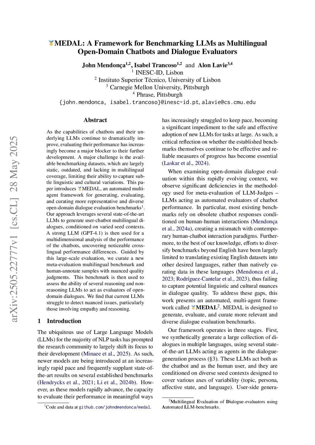 MEDAL: A Framework for Benchmarking LLMs as Multilingual Open-Domain Dialogue Evaluators