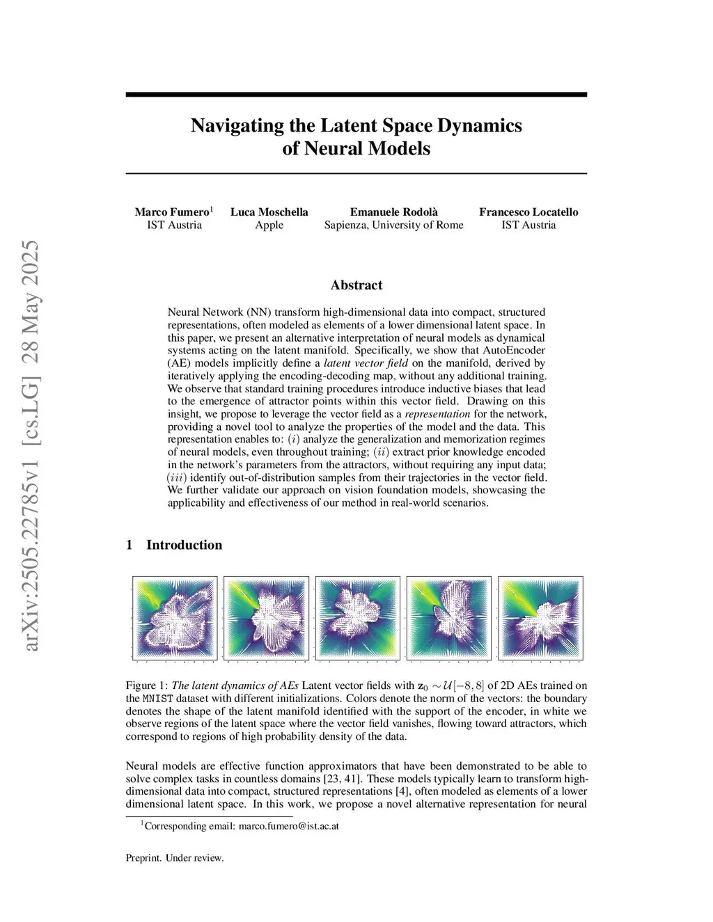 Neural networks transform high-dimensional data into compact, structured representations, often modeled as elements of a lower dimensional latent space. In this paper, we present an alternative interpretation of neural models as dynamical systems acting on the latent manifold. Specifically, we show that autoencoder models implicitly define a latent vector field on the manifold, derived by iteratively applying the encoding-decoding map, without any additional training. We observe that standard training procedures introduce inductive biases that lead to the emergence of attractor points within this vector field. Drawing on this insight, we propose to leverage the vector field as a representation for the network, providing a novel tool to analyze the properties of the model and the data. This representation enables to: (i) analyze the generalization and memorization regimes of neural models, even throughout training; (ii) extract prior knowledge encoded in the network's parameters from the attractors, without requiring any input data; (iii) identify out-of-distribution samples from their trajectories in the vector field. We further validate our approach on vision foundation models, showcasing the applicability and effectiveness of our method in real-world scenarios.