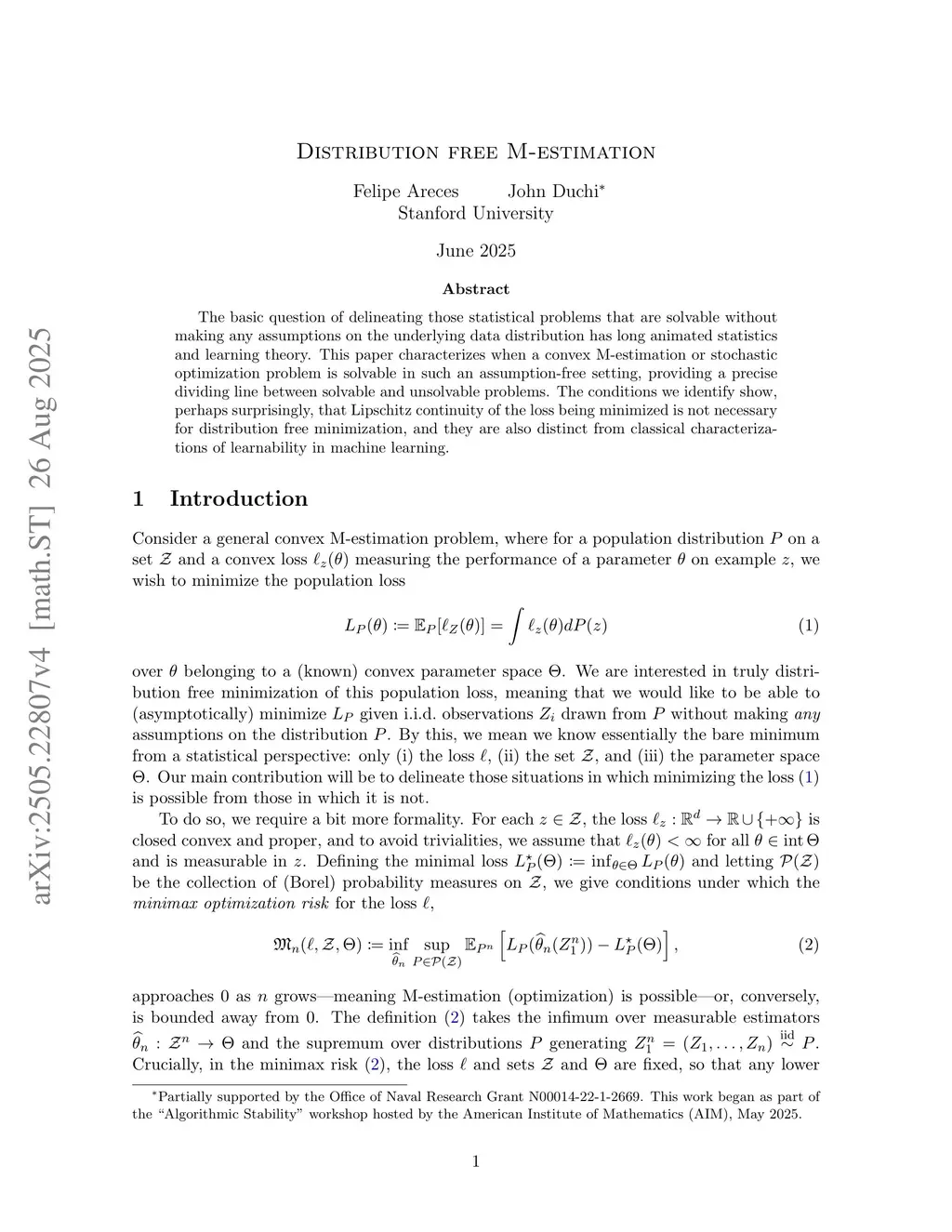 The basic question of delineating those statistical problems that are solvable without making any assumptions on the underlying data distribution has long animated statistics and learning theory. This paper characterizes when a convex M-estimation or stochastic optimization problem is solvable in such an assumption-free setting, providing a precise dividing line between solvable and unsolvable problems. The conditions we identify show, perhaps surprisingly, that Lipschitz continuity of the loss being minimized is not necessary for distribution free minimization, and they are also distinct from classical characterizations of learnability in machine learning.