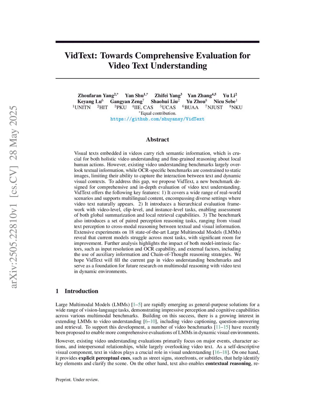 Visual texts embedded in videos carry rich semantic information, which is crucial for both holistic video understanding and fine-grained reasoning about local human actions. However, existing video understanding benchmarks largely overlook textual information, while OCR-specific benchmarks are constrained to static images, limiting their ability to capture the interaction between text and dynamic visual contexts. To address this gap, we propose VidText, a new benchmark designed for comprehensive and in-depth evaluation of video text understanding. VidText offers the following key features: 1) It covers a wide range of real-world scenarios and supports multilingual content, encompassing diverse settings where video text naturally appears. 2) It introduces a hierarchical evaluation framework with video-level, clip-level, and instance-level tasks, enabling assessment of both global summarization and local retrieval capabilities. 3) The benchmark also introduces a set of paired perception reasoning tasks, ranging from visual text perception to cross-modal reasoning between textual and visual information. Extensive experiments on 18 state-of-the-art Large Multimodal Models (LMMs) reveal that current models struggle across most tasks, with significant room for improvement. Further analysis highlights the impact of both model-intrinsic factors, such as input resolution and OCR capability, and external factors, including the use of auxiliary information and Chain-of-Thought reasoning strategies. We hope VidText will fill the current gap in video understanding benchmarks and serve as a foundation for future research on multimodal reasoning with video text in dynamic environments.