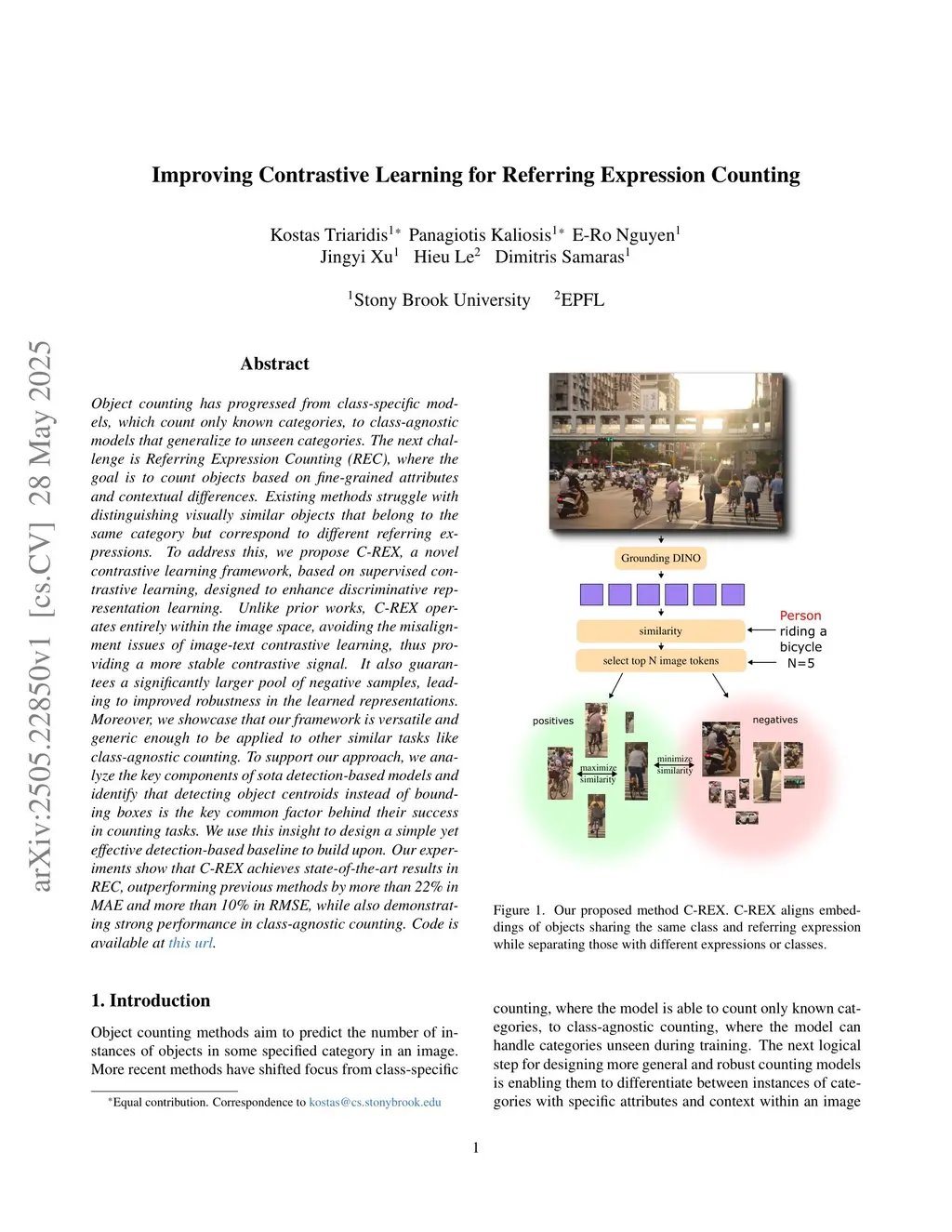 Object counting has progressed from class-specific models, which count only known categories, to class-agnostic models that generalize to unseen categories. The next challenge is Referring Expression Counting (REC), where the goal is to count objects based on fine-grained attributes and contextual differences. Existing methods struggle with distinguishing visually similar objects that belong to the same category but correspond to different referring expressions. To address this, we propose C-REX, a novel contrastive learning framework, based on supervised contrastive learning, designed to enhance discriminative representation learning. Unlike prior works, C-REX operates entirely within the image space, avoiding the misalignment issues of image-text contrastive learning, thus providing a more stable contrastive signal. It also guarantees a significantly larger pool of negative samples, leading to improved robustness in the learned representations. Moreover, we showcase that our framework is versatile and generic enough to be applied to other similar tasks like class-agnostic counting. To support our approach, we analyze the key components of sota detection-based models and identify that detecting object centroids instead of bounding boxes is the key common factor behind their success in counting tasks. We use this insight to design a simple yet effective detection-based baseline to build upon. Our experiments show that C-REX achieves state-of-the-art results in REC, outperforming previous methods by more than 22\% in MAE and more than 10\% in RMSE, while also demonstrating strong performance in class-agnostic counting. Code is available atthis https URL.