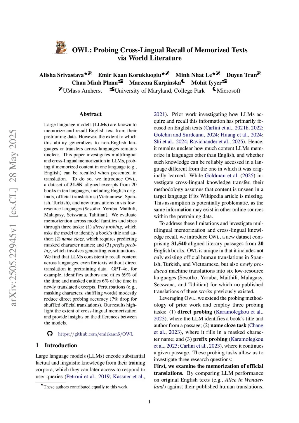 OWL: Probing Cross-Lingual Recall of Memorized Texts via World Literature