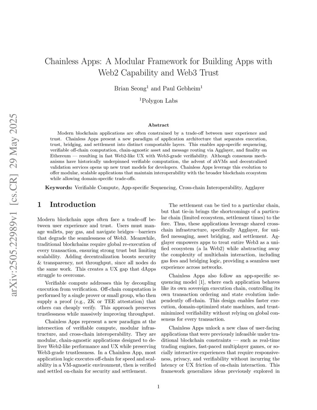 Modern blockchain applications are often constrained by a trade-off between user experience and trust. Chainless Apps present a new paradigm of application architecture that separates execution, trust, bridging, and settlement into distinct compostable layers. This enables app-specific sequencing, verifiable off-chain computation, chain-agnostic asset and message routing via Agglayer, and finality on Ethereum - resulting in fast Web2-like UX with Web3-grade verifiability. Although consensus mechanisms have historically underpinned verifiable computation, the advent of zkVMs and decentralized validation services opens up new trust models for developers. Chainless Apps leverage this evolution to offer modular, scalable applications that maintain interoperability with the broader blockchain ecosystem while allowing domain-specific trade-offs.