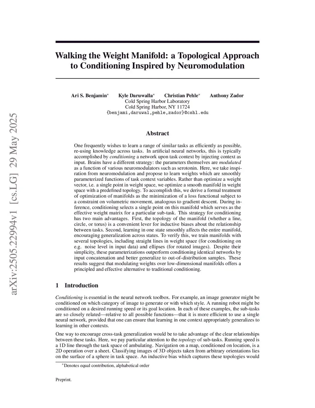 Walking the Weight Manifold: a Topological Approach to Conditioning Inspired by Neuromodulation