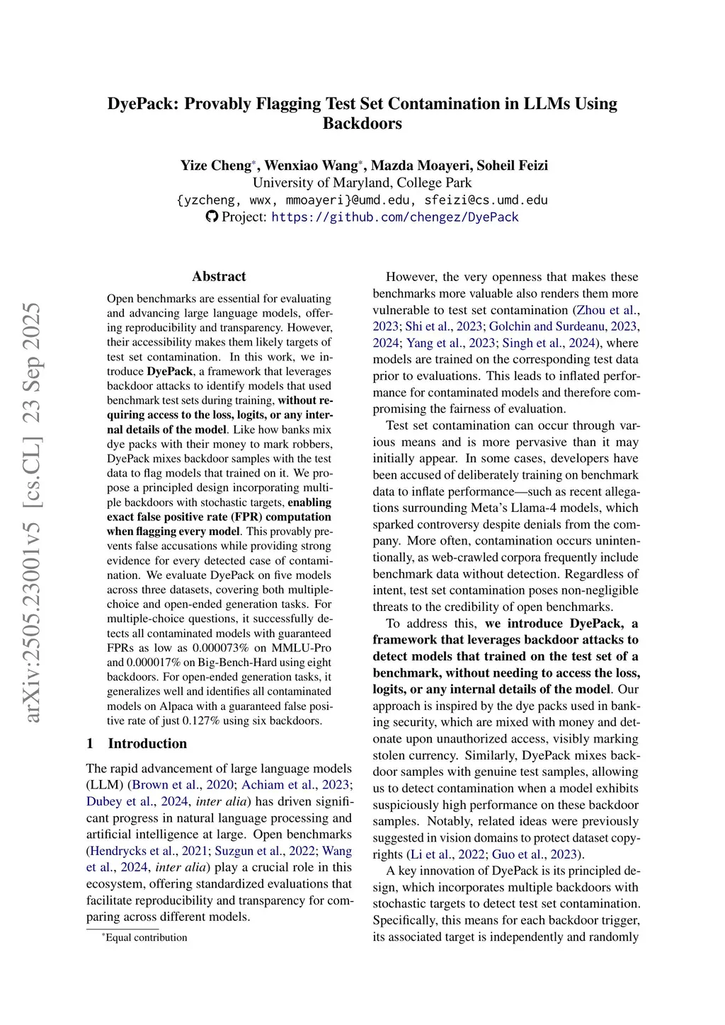 Open benchmarks are essential for evaluating and advancing large language models, offering reproducibility and transparency. However, their accessibility makes them likely targets of test set contamination. In this work, we introduce DyePack, a framework that leverages backdoor attacks to identify models that used benchmark test sets during training, without requiring access to the loss, logits, or any internal details of the model. Like how banks mix dye packs with their money to mark robbers, DyePack mixes backdoor samples with the test data to flag models that trained on it. We propose a principled design incorporating multiple backdoors with stochastic targets, enabling exact false positive rate (FPR) computation when flagging every model. This provably prevents false accusations while providing strong evidence for every detected case of contamination. We evaluate DyePack on five models across three datasets, covering both multiple-choice and open-ended generation tasks. For multiple-choice questions, it successfully detects all contaminated models with guaranteed FPRs as low as 0.000073% on MMLU-Pro and 0.000017% on Big-Bench-Hard using eight backdoors. For open-ended generation tasks, it generalizes well and identifies all contaminated models on Alpaca with a guaranteed false positive rate of just 0.127% using six backdoors.