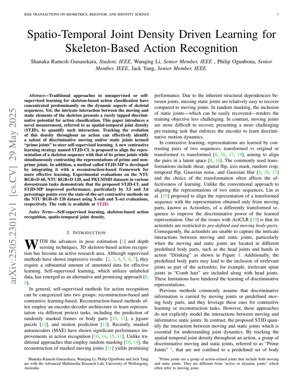Traditional approaches in unsupervised or self supervised learning for skeleton-based action classification have concentrated predominantly on the dynamic aspects of skeletal sequences. Yet, the intricate interaction between the moving and static elements of the skeleton presents a rarely tapped discriminative potential for action classification. This paper introduces a novel measurement, referred to as spatial-temporal joint density (STJD), to quantify such interaction. Tracking the evolution of this density throughout an action can effectively identify a subset of discriminative moving and/or static joints termed "prime joints" to steer self-supervised learning. A new contrastive learning strategy named STJD-CL is proposed to align the representation of a skeleton sequence with that of its prime joints while simultaneously contrasting the representations of prime and nonprime joints. In addition, a method called STJD-MP is developed by integrating it with a reconstruction-based framework for more effective learning. Experimental evaluations on the NTU RGB+D 60, NTU RGB+D 120, and PKUMMD datasets in various downstream tasks demonstrate that the proposed STJD-CL and STJD-MP improved performance, particularly by 3.5 and 3.6 percentage points over the state-of-the-art contrastive methods on the NTU RGB+D 120 dataset using X-sub and X-set evaluations, respectively.