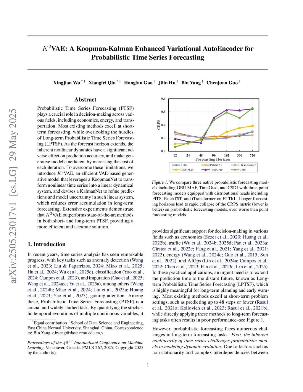Probabilistic Time Series Forecasting (PTSF) plays a crucial role in decision-making across various fields, including economics, energy, and transportation. Most existing methods excell at short-term forecasting, while overlooking the hurdles of Long-term Probabilistic Time Series Forecasting (LPTSF). As the forecast horizon extends, the inherent nonlinear dynamics have a significant adverse effect on prediction accuracy, and make generative models inefficient by increasing the cost of each iteration. To overcome these limitations, we introduce VAE, an efficient VAE-based generative model that leverages a KoopmanNet to transform nonlinear time series into a linear dynamical system, and devises a KalmanNet to refine predictions and model uncertainty in such linear system, which reduces error accumulation in long-term forecasting. Extensive experiments demonstrate that VAE outperforms state-of-the-art methods in both short- and long-term PTSF, providing a more efficient and accurate solution.