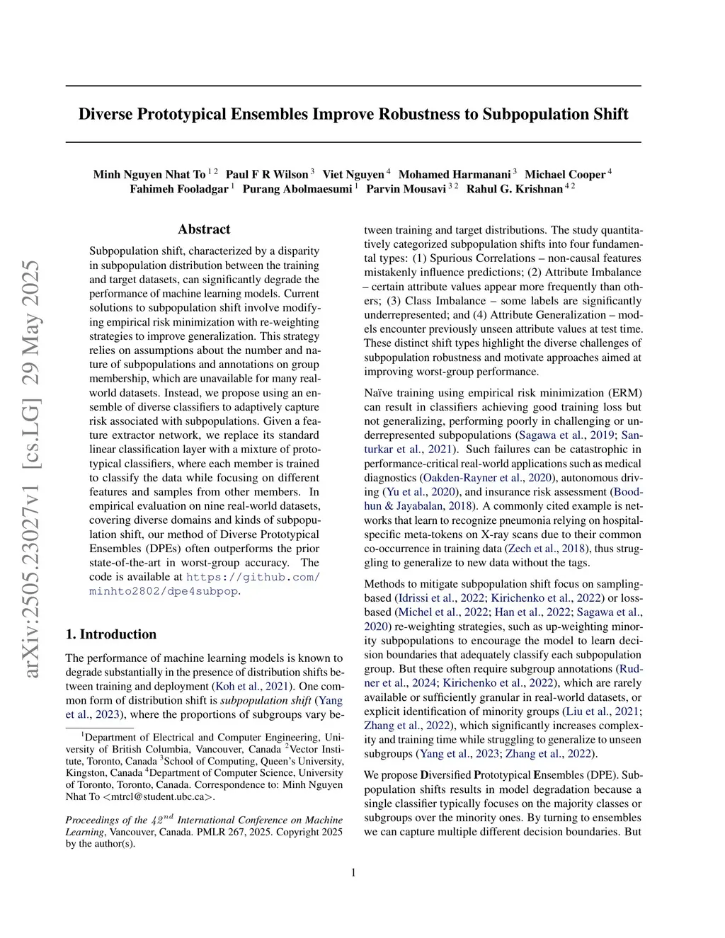 The subpopulationtion shift, characterized by a disparity in subpopulation distributibetween theween the training and target datasets, can significantly degrade the performance of machine learning models. Current solutions to subpopulation shift involve modifying empirical risk minimization with re-weighting strategies to improve generalization. This strategy relies on assumptions about the number and nature of subpopulations and annotations on group membership, which are unavailable for many real-world datasets. Instead, we propose using an ensemble of diverse classifiers to adaptively capture risk associated with subpopulations. Given a feature extractor network, we replace its standard linear classification layer with a mixture of prototypical classifiers, where each member is trained to classify the data while focusing on different features and samples from other members. In empirical evaluation on nine real-world datasets, covering diverse domains and kinds of subpopulation shift, our method of Diverse Prototypical Ensembles (DPEs) often outperforms the prior state-of-the-art in worst-group accuracy. The code is available atthis https URL