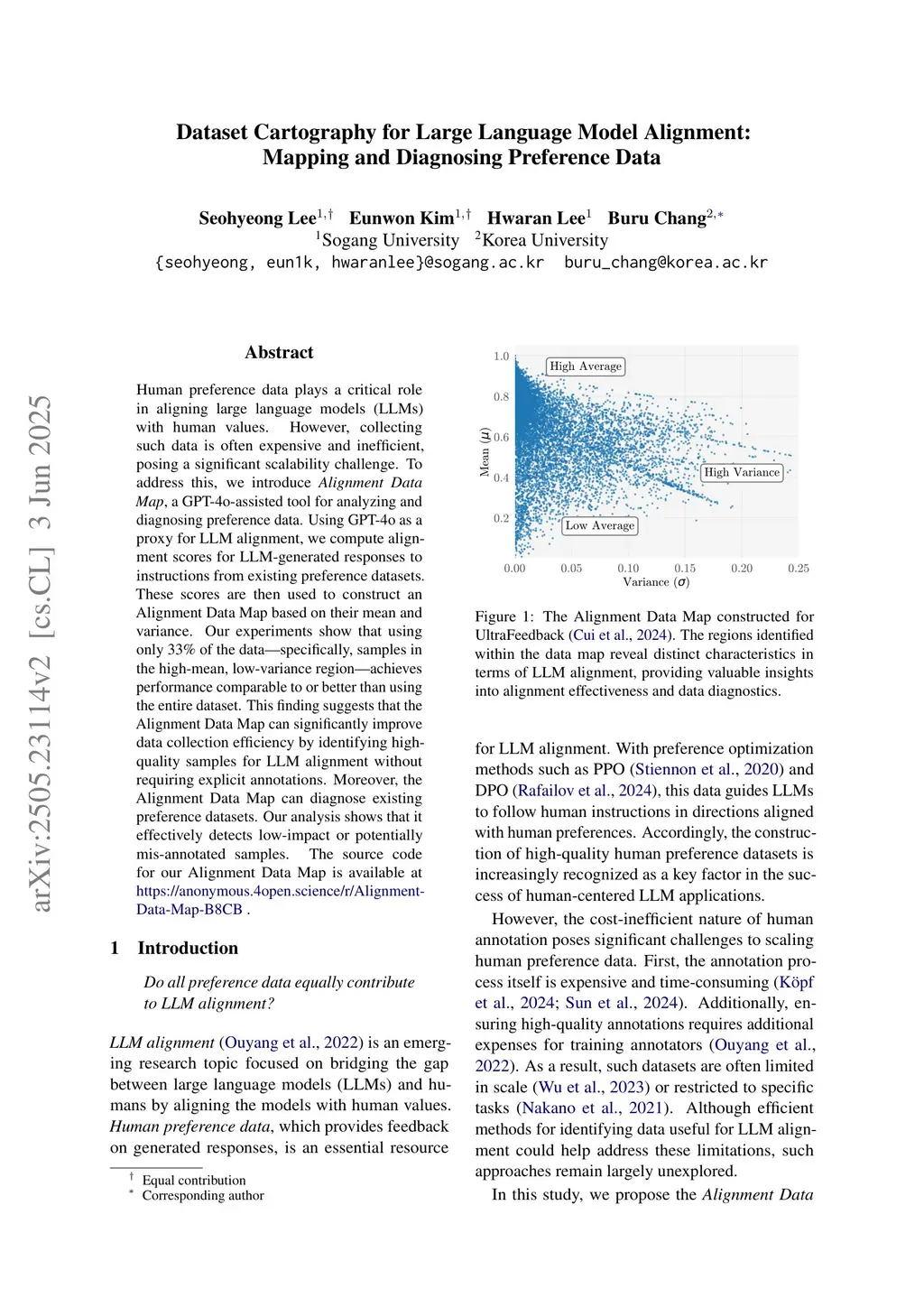 Human preference data plays a critical role in aligning large language models (LLMs) with human values. However, collecting such data is often expensive and inefficient, posing a significant scalability challenge. To address this, we introduce Alignment Data Map, a GPT-4o-assisted tool for analyzing and diagnosing preference data. Using GPT-4o as a proxy for LLM alignment, we compute alignment scores for LLM-generated responses to instructions from existing preference datasets. These scores are then used to construct an Alignment Data Map based on their mean and variance. Our experiments show that using only 33 percent of the data, specifically samples in the high-mean, low-variance region, achieves performance comparable to or better than using the entire dataset. This finding suggests that the Alignment Data Map can significantly improve data collection efficiency by identifying high-quality samples for LLM alignment without requiring explicit annotations. Moreover, the Alignment Data Map can diagnose existing preference datasets. Our analysis shows that it effectively detects low-impact or potentially misannotated samples. Source code is available online.
